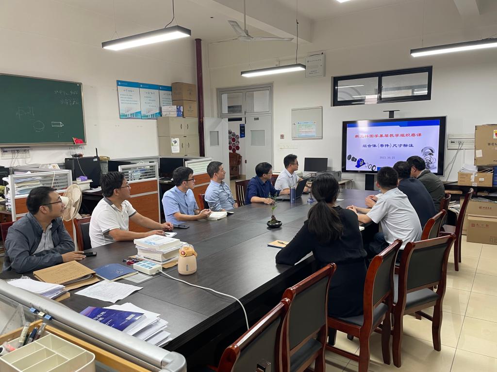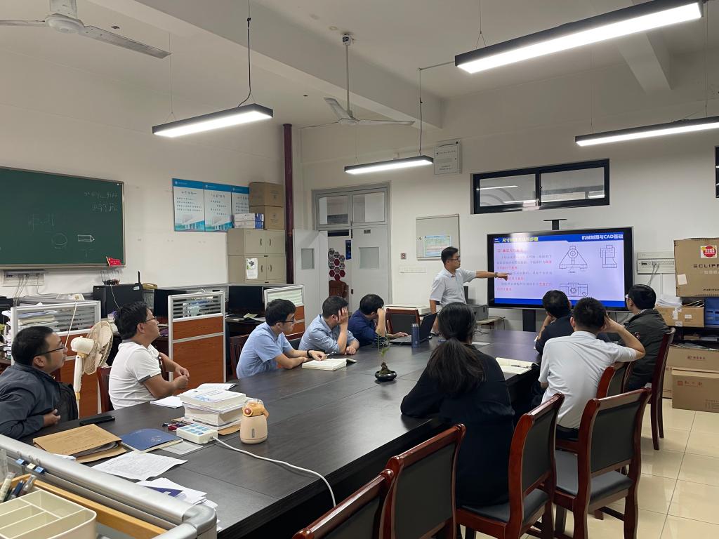 2023年10月25日,新工科图学基层教学组织围绕“组合体尺寸标注”开展了精彩的磨课活动。基层教学组织负责人许少锋首先做了组合体尺寸标注的相关教学示范,随后课程组成员就尺寸基准和组合体的标注方法展开了激烈精彩的讨论。
