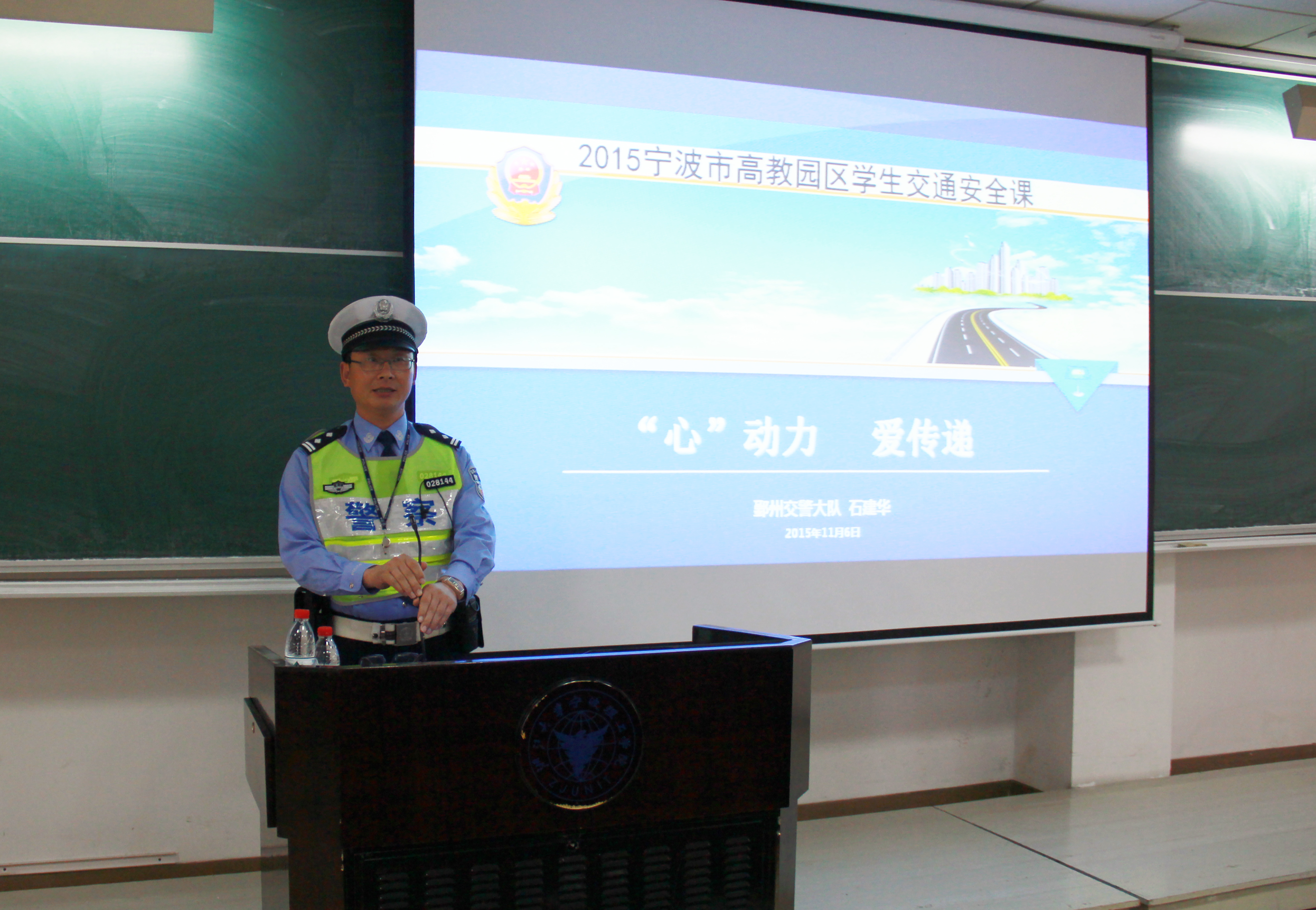 2015年11月6日下午,由机能学院主办的2015年“校园安全月”之交通安全知识专题讲座在NF101举行,本次讲座邀请了鄞州交警大队石建华警官主讲,学校保卫处副处长叶卫树、业务主管王成、冯财杰等老师出席本次活动。讲座由机能学院思政主管胡鹿鸣老师主持。