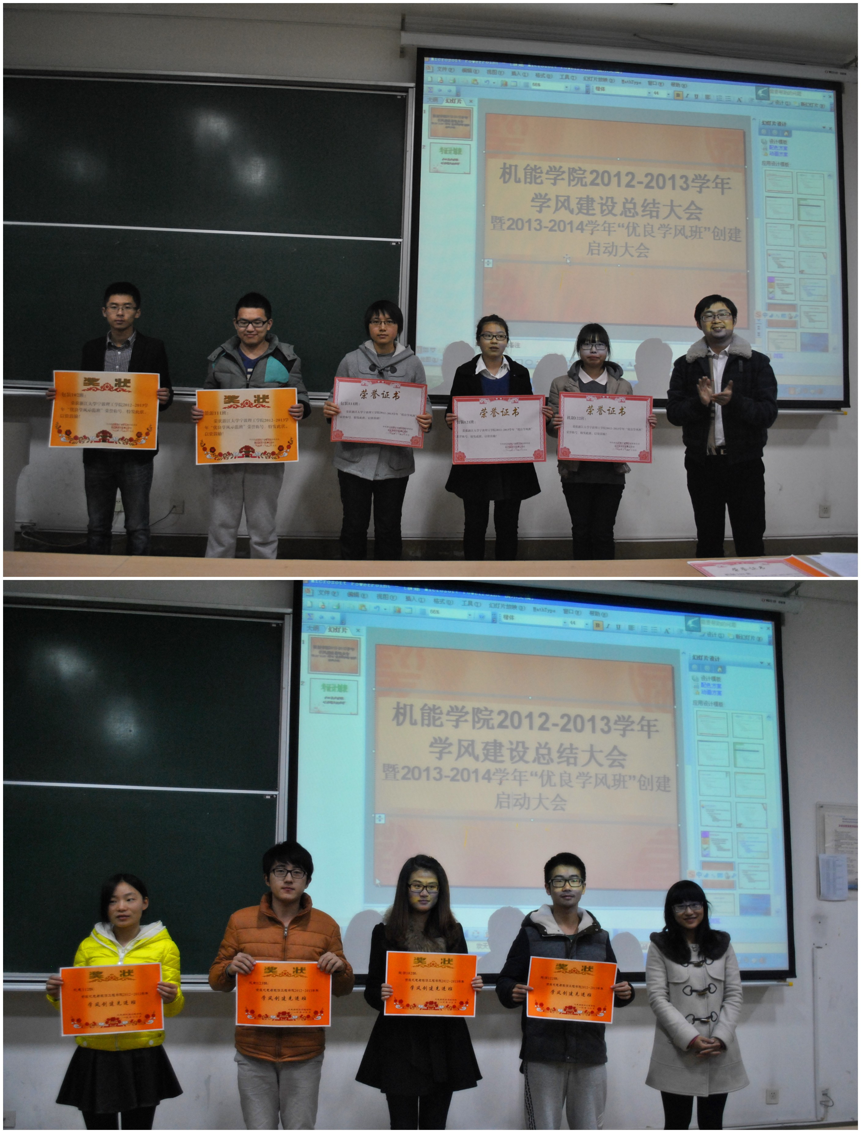 机能学院2012-2013学年学风建设总结暨13-14学年“优良学风班”创建启动大会于2013年12月12日晚17:30在SC218举行,思政主管胡鹿鸣老师、辅导员仇芳老师、各班班委、班干部、“优良学风班”班级代表出席该次会议。