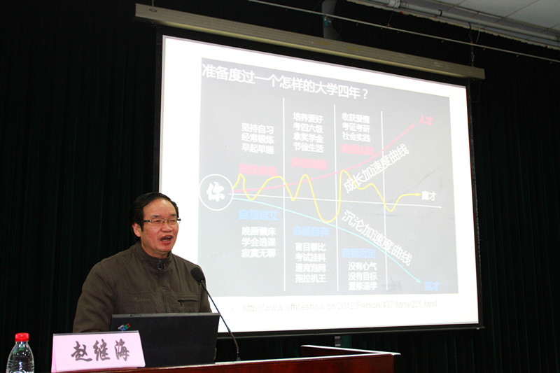 赵继海老师的演讲朴实而不失内涵,他一开始就结合形象的成长曲线,启发同学们准备度过一个怎样的大学四年,并提出“一个不读书的民族是危险的民族”的观点。然后,赵老师从“为什么读书?”、“读什么书?”、“怎样读书”等几个方面展开讲座。
