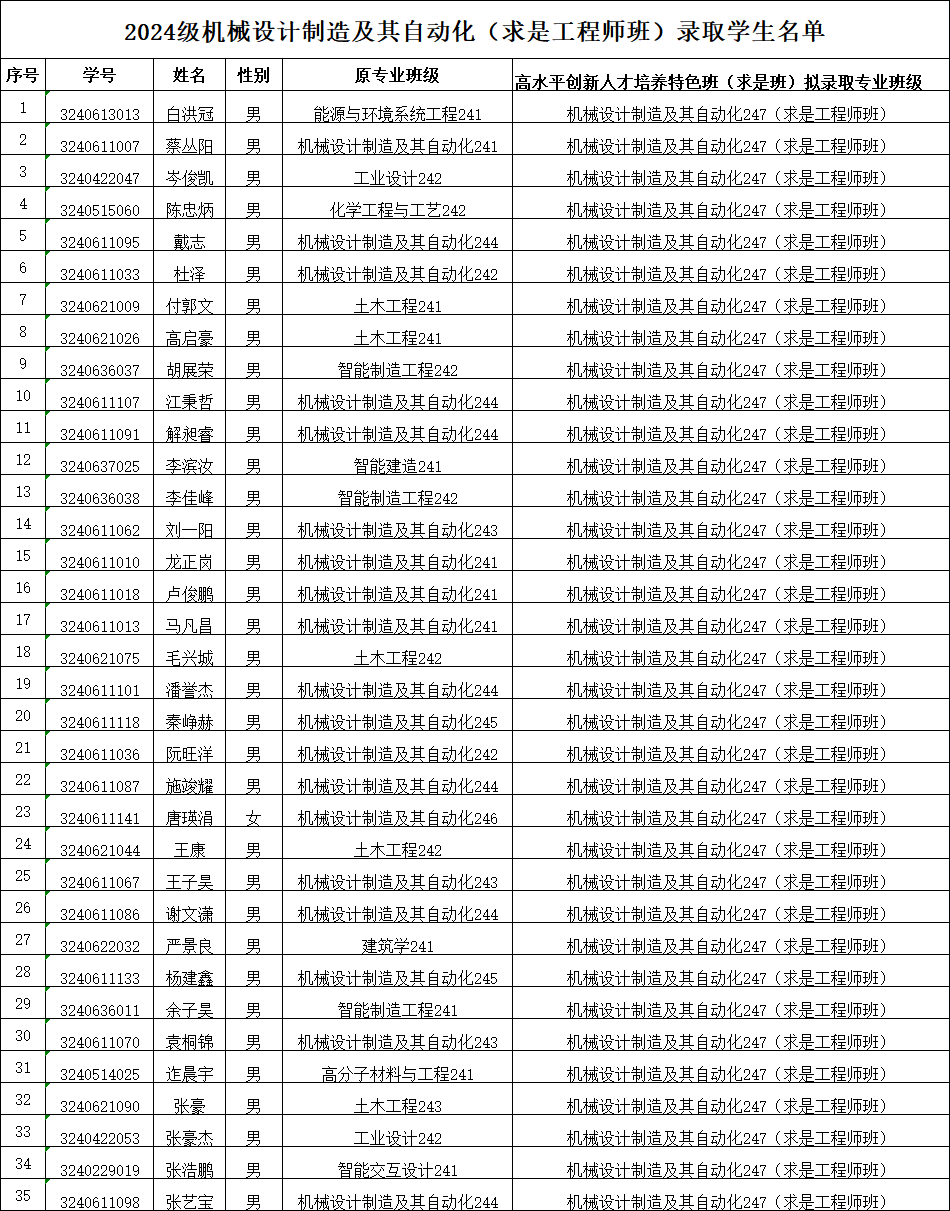 根据学校高水平创新人才培养特色班选拔工作安排,经学生申请,学校资格审查,学院组织面试后,拟同意白洪冠等35名同学入选2024级机械设计制造及其自动化(求是工程师班)。现将具体名单予以公示如下。