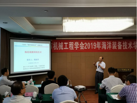 会上,首先杨灿军教授做了“海底观测网络技术”专题报告,对我国最新的海底观测网络和海底网络接驳、水下清洗装备等进行了介绍。其次,宁波中策动力机电研究院有限公司王雷院长做了“中速大功率燃气发动机技术与应用”专题报告,对公司最新的双燃料燃气发动机技术进行了介绍。会议后期,宁波大学王永刚教授对获得国家奖的大型桥梁防船撞关键技术与应用做了汇报。最后学会副理事长、学院陈俊华教授介绍了团队近年来围绕海洋牧场建设中的海洋养殖装备技术进行的研究。
