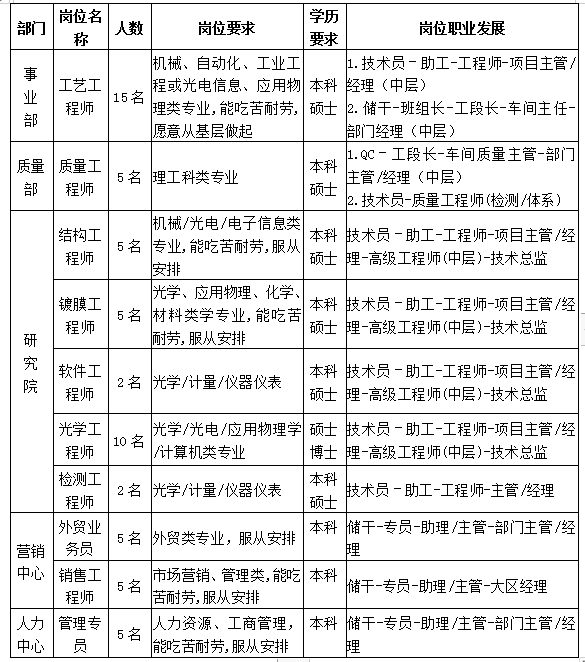 二、招聘岗位与要求(机械、自动化、光电、应用物理、材料、化学)
