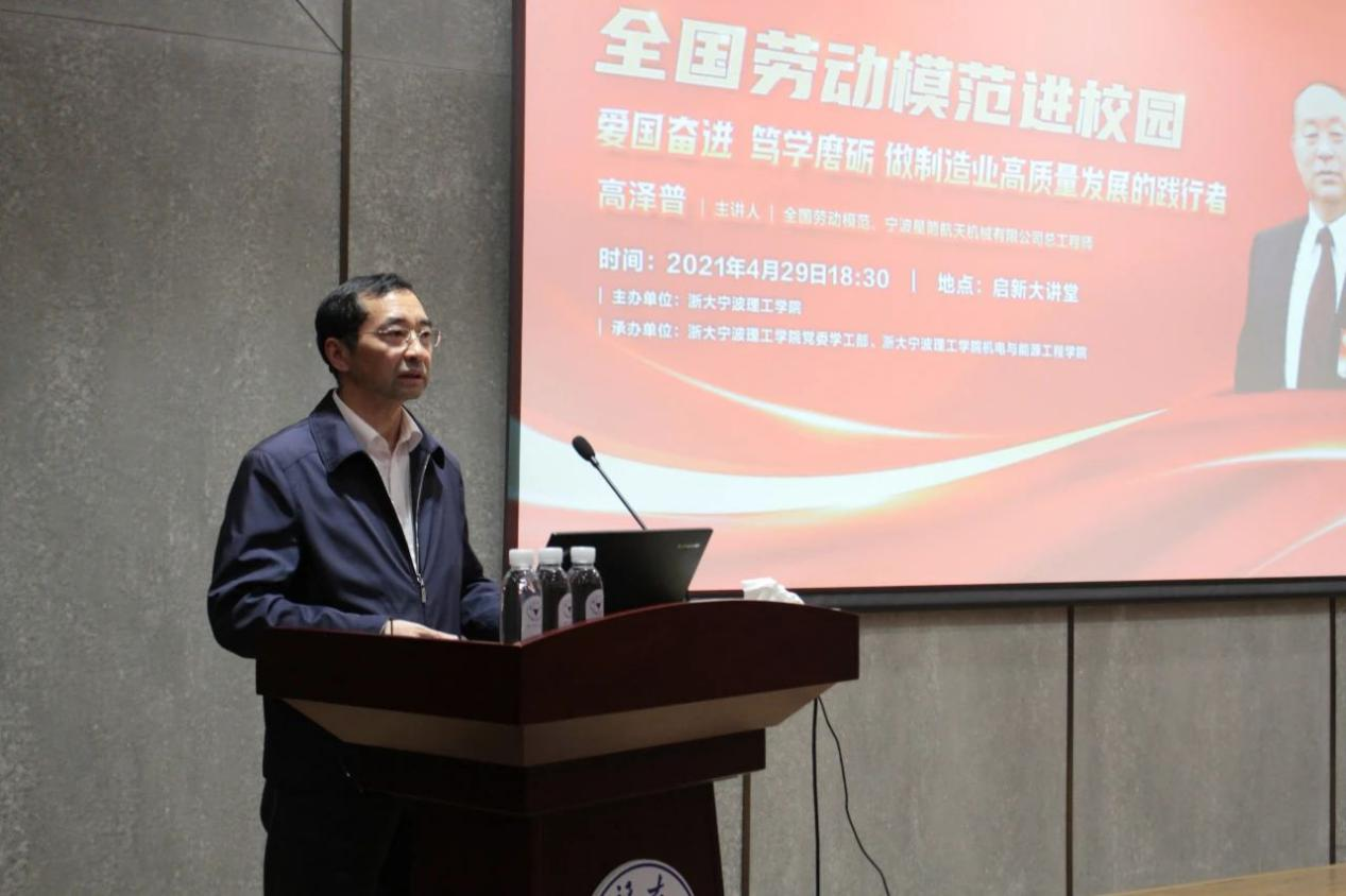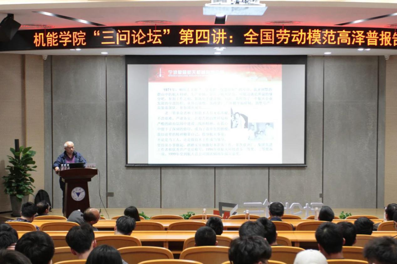 4月29日晚18时30分,值“五一”国际劳动节来临之际,学校党委学工部和机能学院“三问论坛”第四讲邀请到全国劳动模范、宁波星箭航天机械有限公司总工程师高泽普来我校做题为《爱国奋进笃学磨砺做制造业高质量发展的践行者》专题讲座。讲座由机能学院党委书记童微星老师主持。讲座吸引了来自各学院两百余名师生前来聆听。