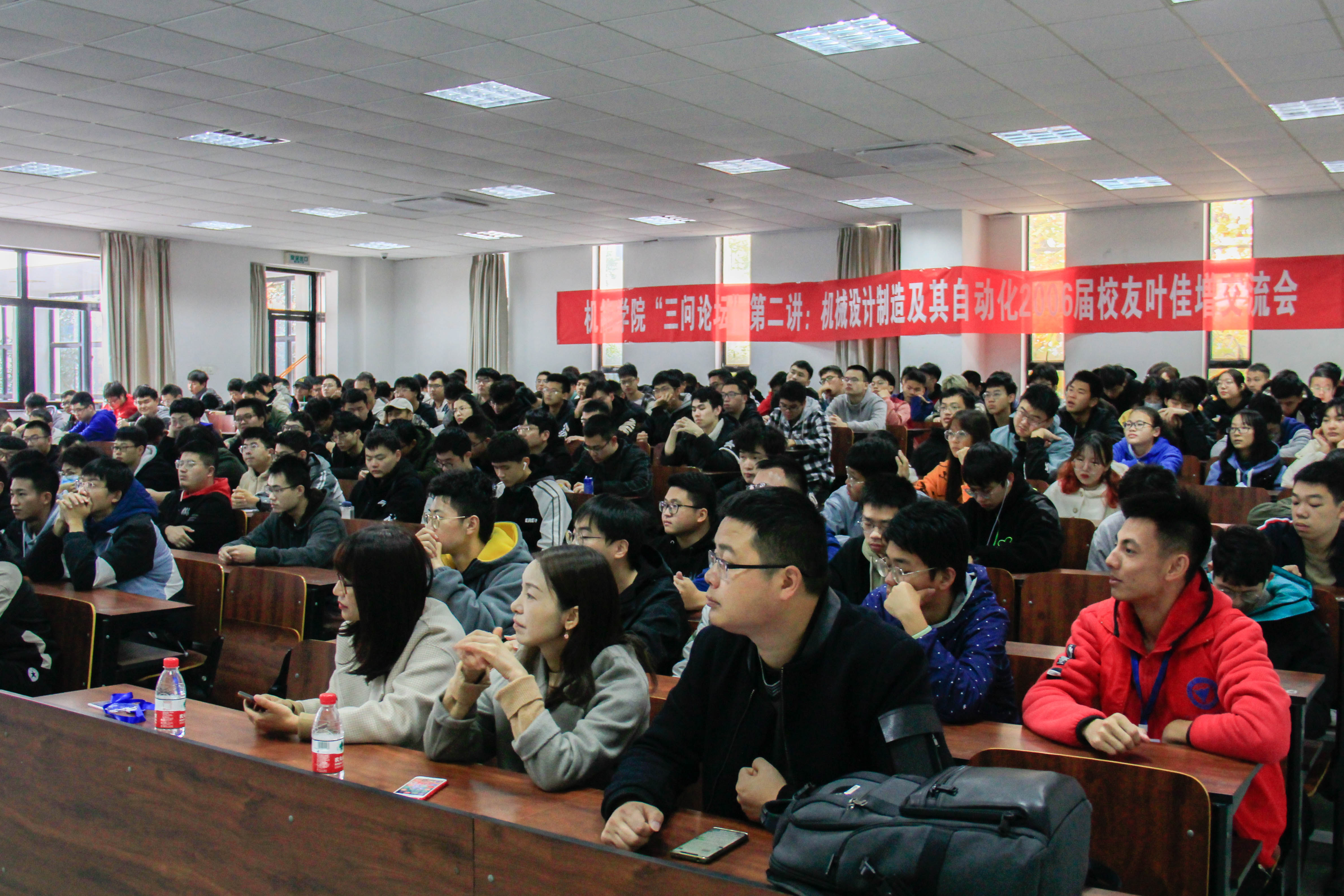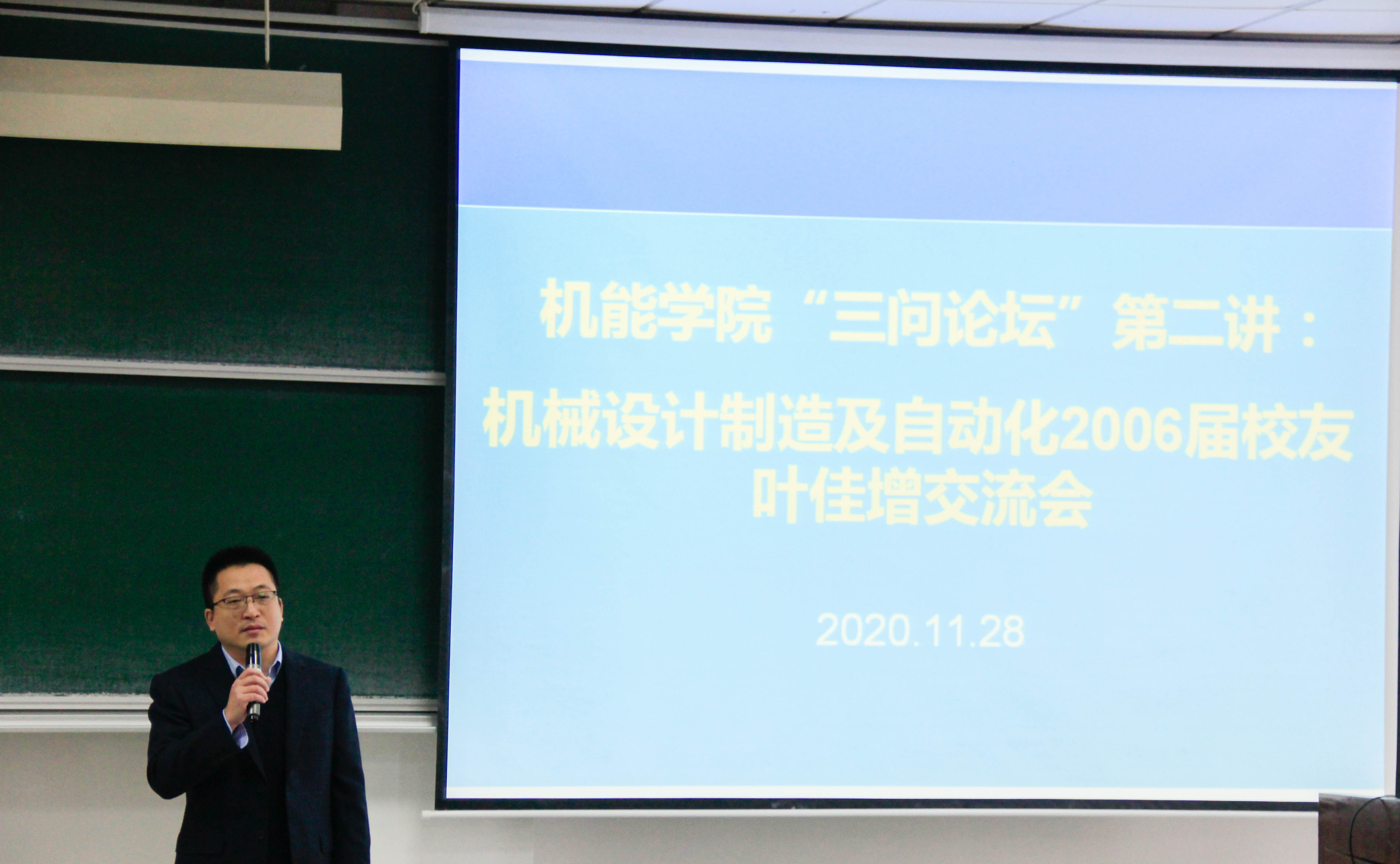 11月28日上午10:00,机能学院在NC201教室举行“三问论坛”第二讲,学院邀请机械设计制造及其自动化专业2006届优秀校友代表叶佳增回校交流。机能学院党委副书记王晶老师、团委书记仇芳老师、辅导员王海波老师和大一至大四近三百名同学一起参加了本次活动。