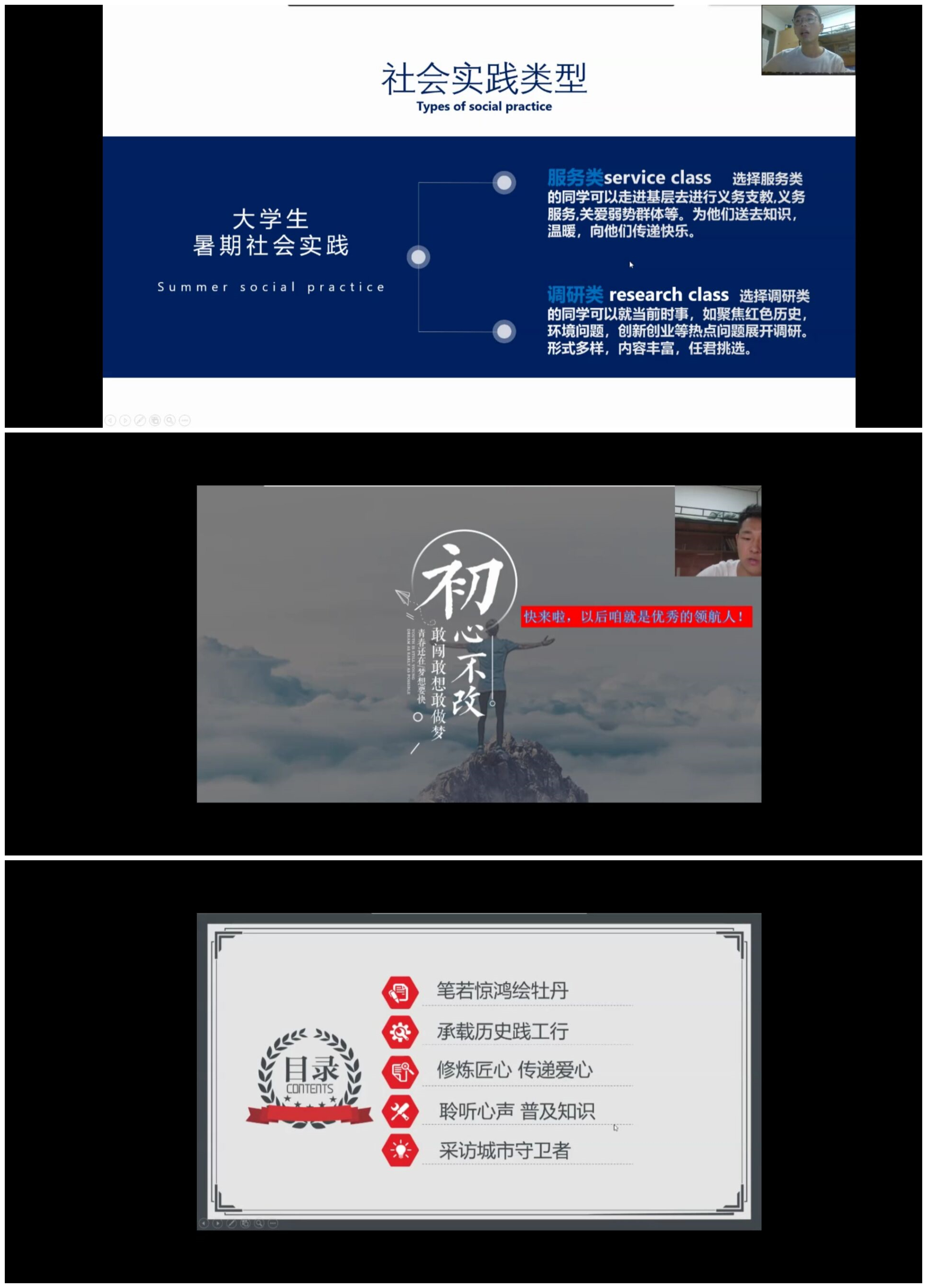 随后,2019年的暑期社会实践团队代表们也分享了他们的一些经验。“五四火炬,百年领航”队伍代表郑益平同学和“工行实践”队伍代表张宸伟同学分别介绍了去年的实践内容和实践成果,展示了到乡村、到基层社区去进行志愿服务,发扬传统文化的活动经历,以及过程中的收获。希望大一的同学们可以再接再厉,让自己的青春不留遗憾。最后,马雨润同学对大学生社会实践的类型进行了介绍,详细介绍了本年度社会实践的时间安排及主题内容,提醒即将开展社会实践的同学们要多一些耐心、专心、注重创新。