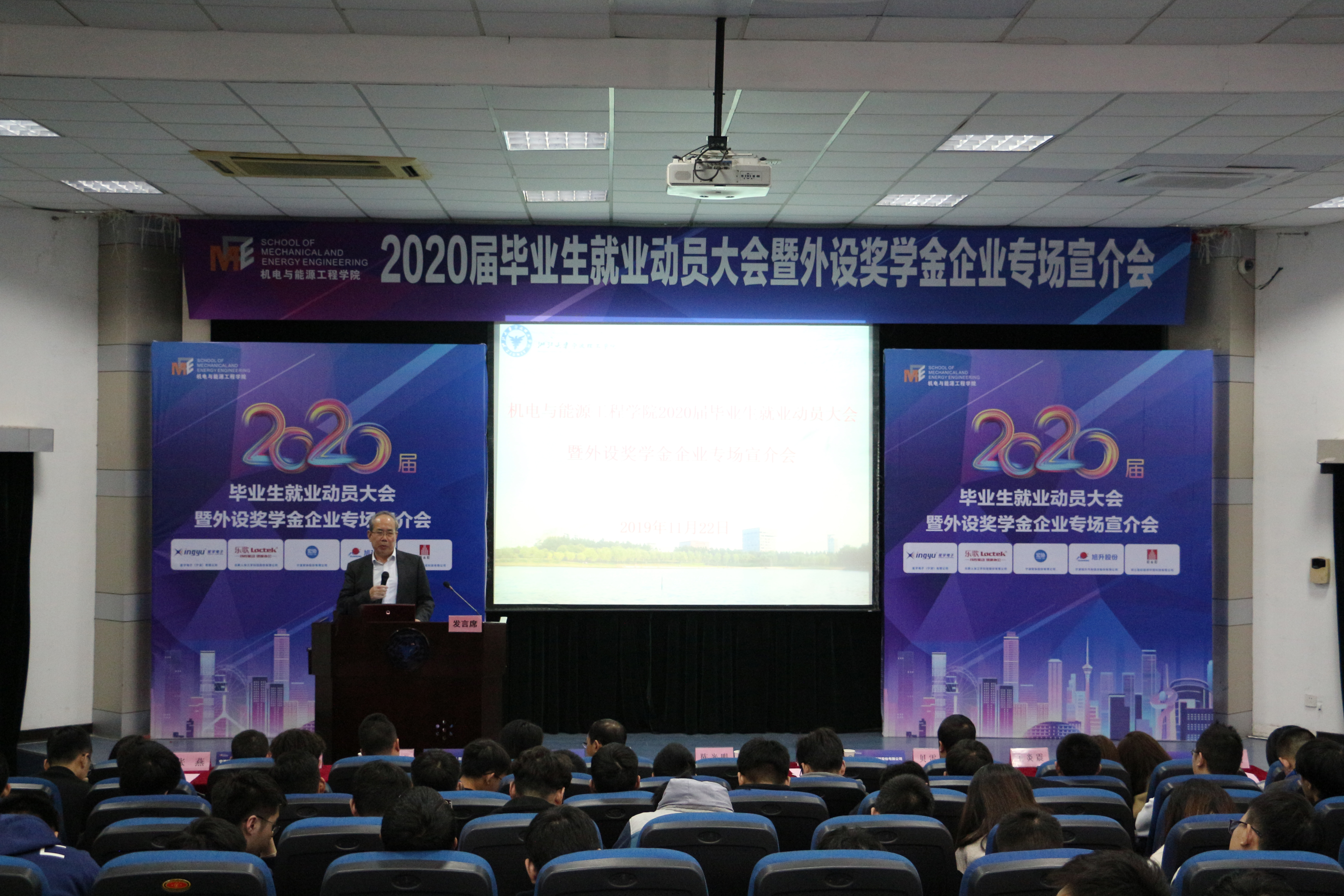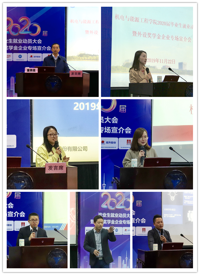 11月22日下午,机能学院在NF103教室举行2020届毕业生就业动员大会暨外设奖学金企业专场宣介会。学院外设奖学金企业,乐歌人体工学科技股份有限公司人事经理杨慧女士、精益生产总监贝雷贤先生,宁波宏协股份有限公司人力资源部经理虞盼攀女士,星宇电子(宁波)有限公司人事行政部总监江伟峰先生,宁波旭升汽车技术股份有限公司人力资源副经理蔡涛先生、招聘专员张燕女士,浙江宏纪能源环境科技有限公司总经理王炎震女士、项目负责人杜晶晶女士、人事专员蔡双璐女士等嘉宾莅临现场。机能学院院长陈光明教授,学院党委书记、副院长童微星老师,以及毕业班班导师和学院全体2020届毕业生参加会议。本次大会由学院党委副书记、纪委书记王晶老师主持。