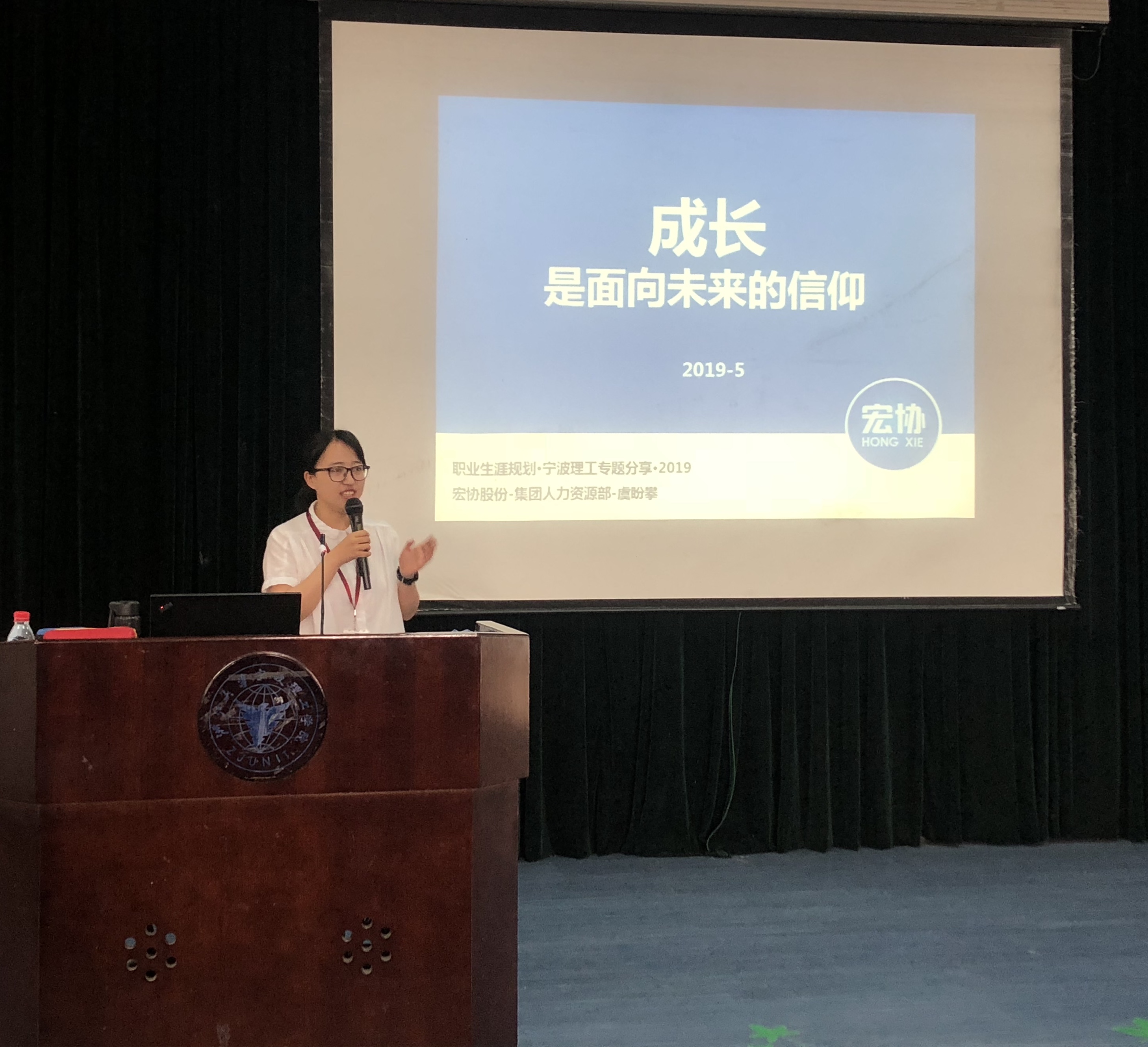 为进一步加强对学生的就业指导和职业规划,推进校企合作,机能学院于5月10日特邀宁波宏协股份有限公司人力资源部经理虞盼攀女士为机能学院2016级全体学生带来《成长,是面向未来的信仰》专题讲座,讲座由学院学工办思政副主管仇芳老师主持。