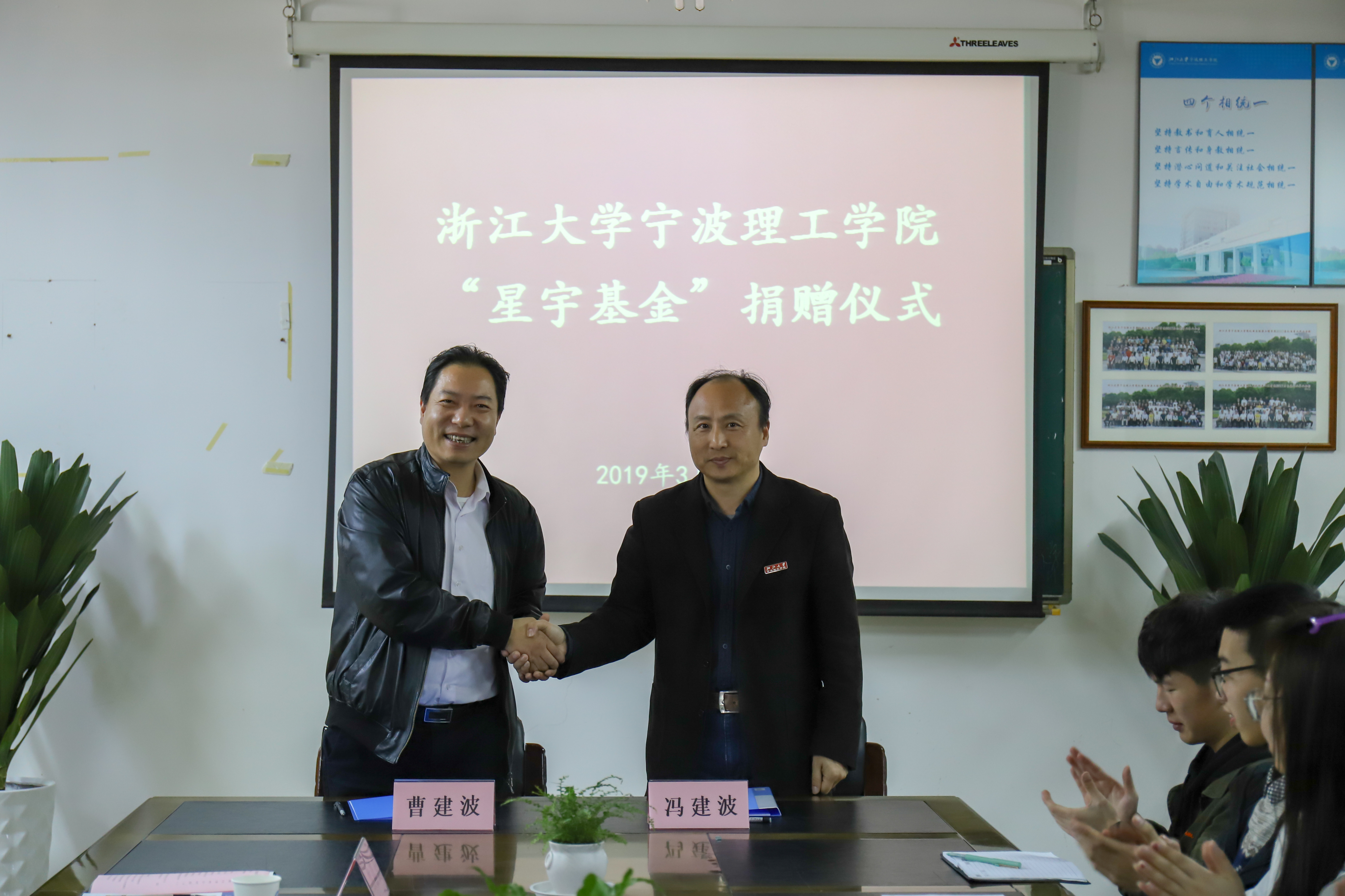会议伊始,由学校党委副书记、副院长冯建波老师致欢迎词,他代表全校师生向爱心企业致以诚挚感谢,并希望校企双方能够进一步扩展校企合作空间,建立多方面的合作平台,促进产学研不断融合。党委副书记、副院长冯建波老师和星宇电子(宁波)有限公司总裁曹建波先生代表校企双方签订“星宇基金”捐赠协议,冯建波老师向企业颁发捐赠证书。机能学院院长陈光明老师就机能学院的情况与企业做了交流,他对企业的慷慨捐赠表示衷心的感谢,并希望同学们努力学习和发扬企业家精神,为建设宁波,建设浙江,建设中国尽自己的一份力量。