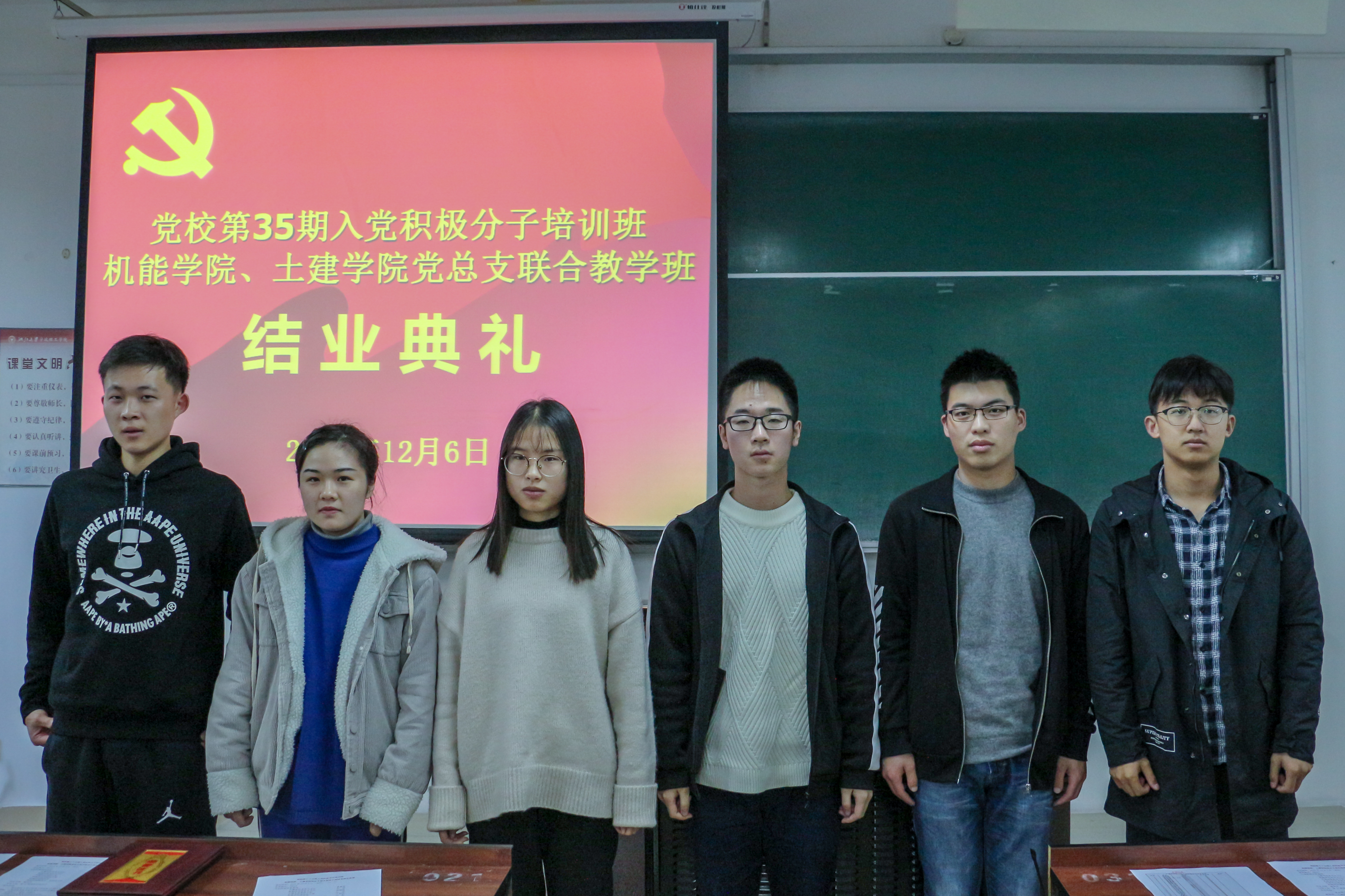 12月6日中午12:30,在NB224举行了党校第35期入党积极分子培训班机能学院、土建学院党总支联合教学小班结业典礼,出席典礼的领导和老师有:土建学院党总支书记童微星老师、机能学院党总支书记吴春老师、土建学院思政主管周丽娟老师、辅导员曲昊杨老师、周星老师,机能学院思政副主管仇芳老师、辅导员王海波老师、刘舒老师。典礼由刘舒老师主持,第35期党校全体学员参加本次典礼。