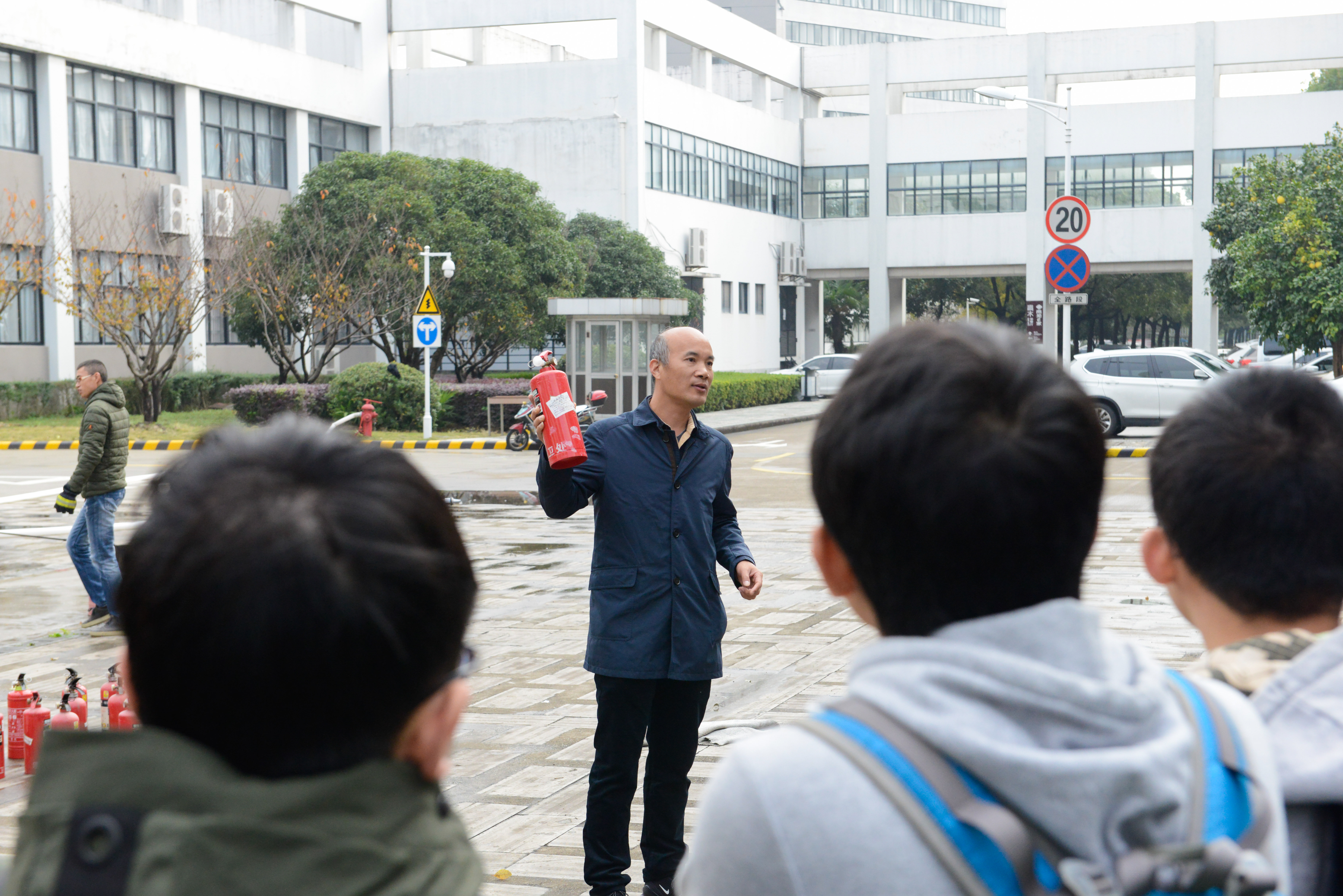 完成疏散后,吴春老师对本次演习进行了点评,保卫处叶卫树老师为师生们介绍了火灾逃生的一些注意事项,强调逃生过程中要防止烟雾呛入口鼻,切勿慌乱,并向大家讲解了几种灭火原理。之后,保卫处老师向大家展示灭火器的使用方法,在场师生参与了湿布灭火和灭火器灭火的操作演习。