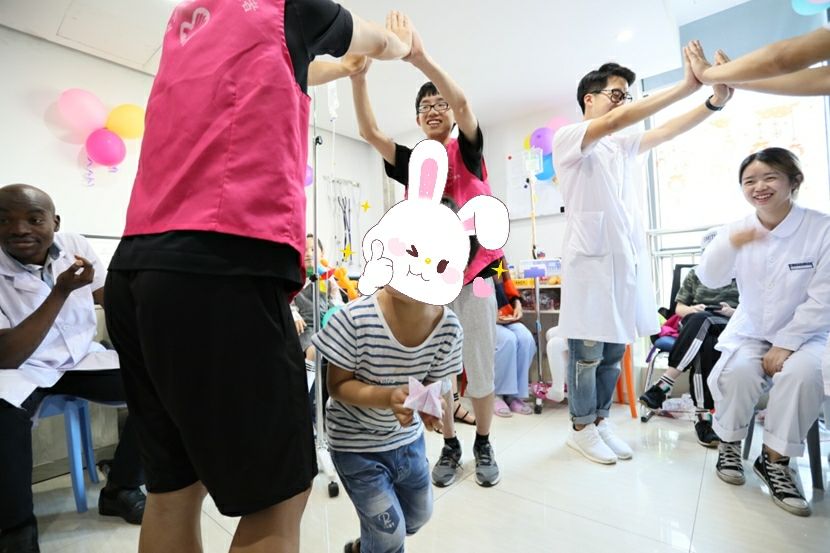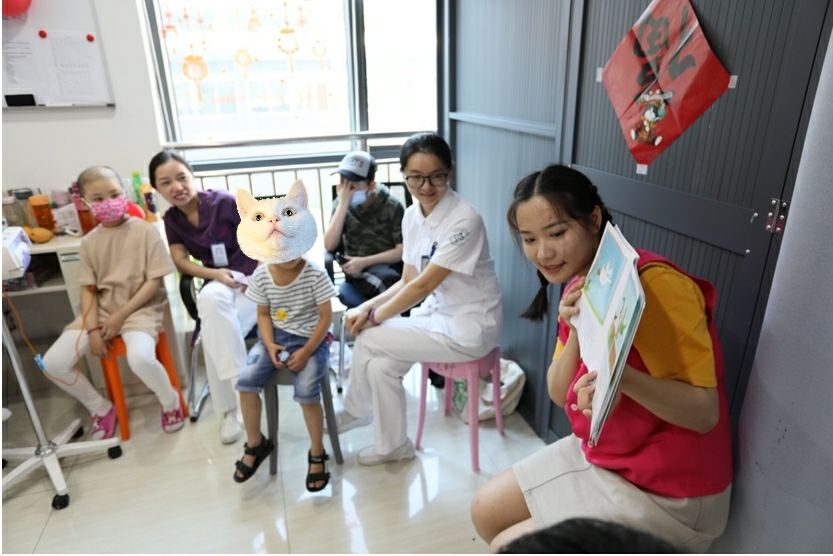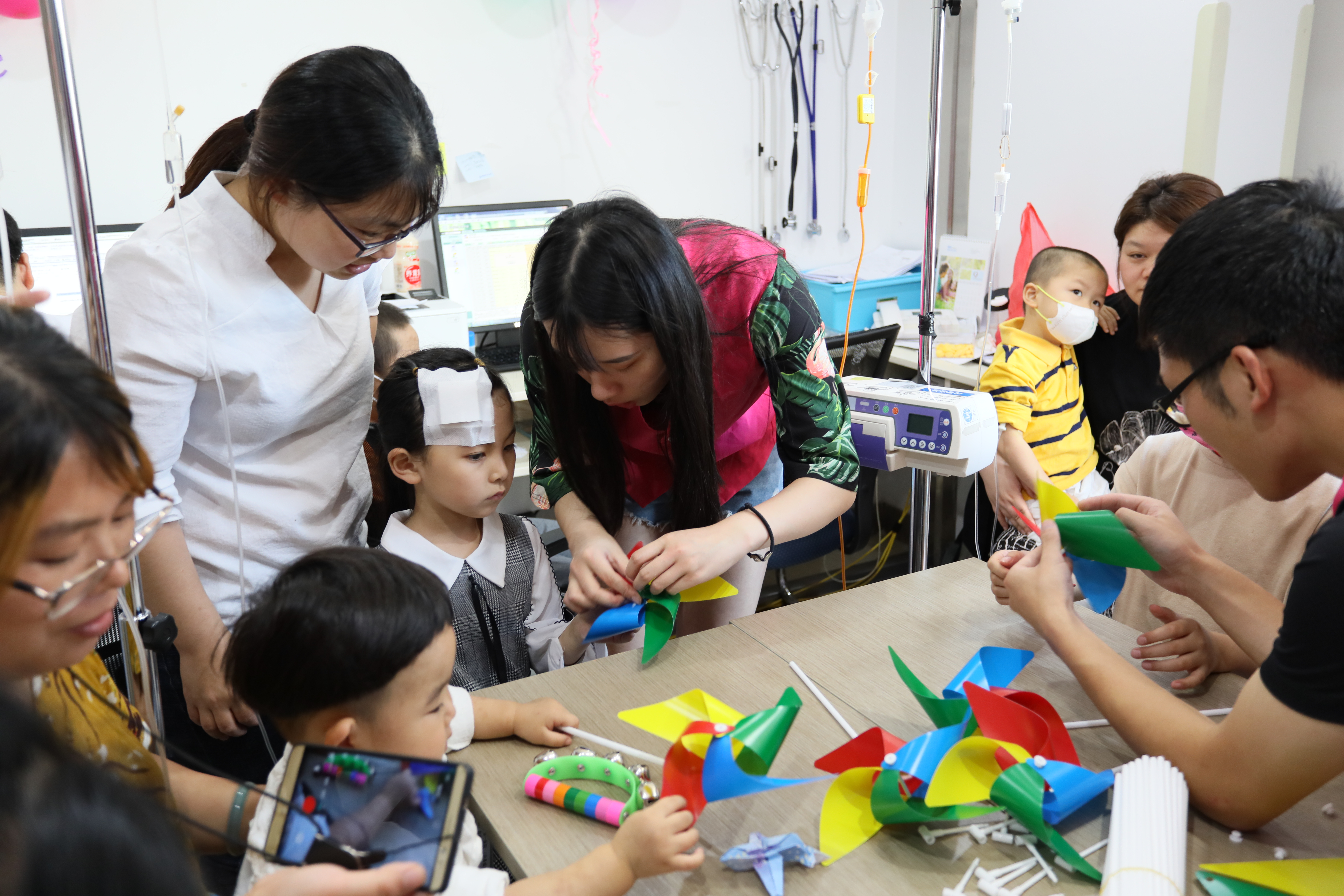 团队首次活动定在一年一度的“六一”国际儿童节,前期经过与宁波市第一医院儿科多次沟通、修改方案,成功举行了本次病房学校“六一”主题活动。六一当天,同学们换上了小黄人套装,它的出现一下子就吸引了在场所有小朋友的目光,他们都围着小黄人转,争着和它玩耍。接着是风车制作环节,小朋友们纤细的手上打着点滴,但小手中扔握着制作好的风车在空中来回摆动,听着风车穿过空气发出嗖嗖的声音,别提有多开心了。最后进行的便是绘本阅读活动,暑期社会实践队的成员们经过精心的准备,绘声绘色地给小朋友们讲绘本上的故事,小朋友们一个个都认真听讲,争先恐后地来扮演书中的角色。活动期间,医院一改往常的沉闷充满着欢声笑语。