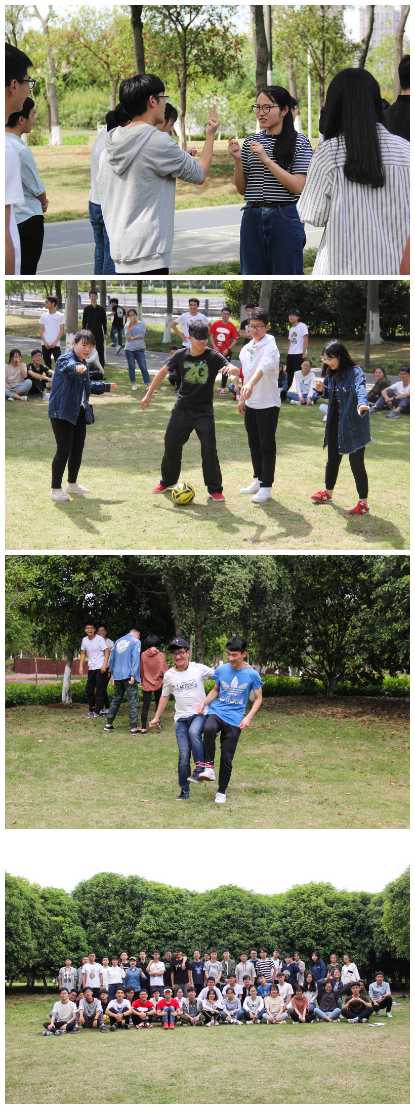 此次活动的比赛项目包括你画我猜、盲人足球、两人三足等趣味团队活动。比赛共分为6组,所有同学按照组次依次参加活动。在你画我猜中,成员们热情高涨,认真比划;盲人足球,成员不辨东西,四处找球的模样,让现场笑声不断。最后一个项目是两人三足,团队成员分工明确,合作默契,一队比一队更快地完成任务,完美的展现了团队合作的默契。比赛间隙更有“挖宝”环节,同学们在林间、树丛中、草坪上细细寻找超级大奖,随着一声欢呼,超级大奖也有了答案。下午17时左右,本次素质拓展课程结束,同学们带着满心愉悦返回校园。