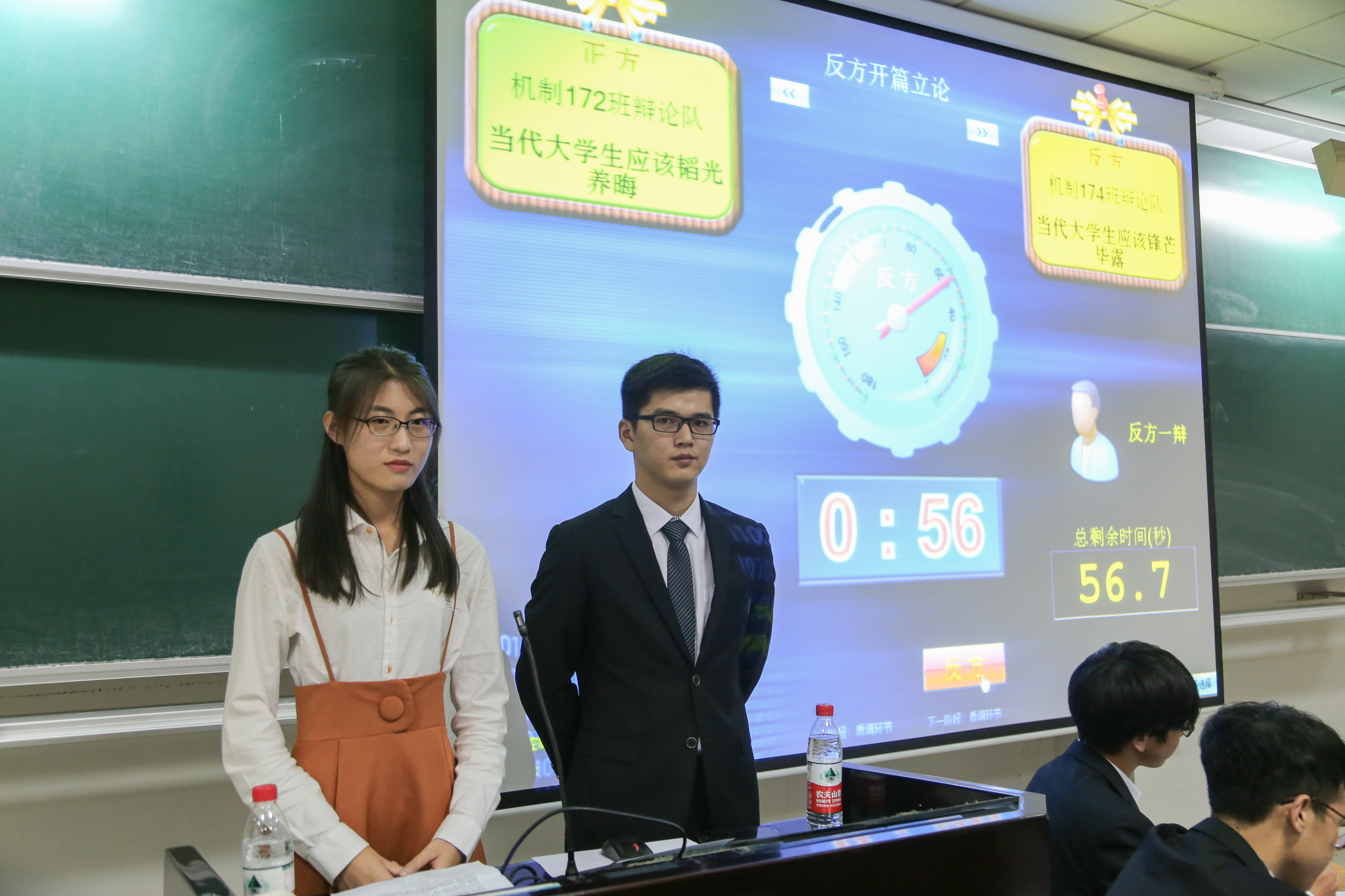 第一场,机制172班与机制174班围绕着“当代大学生应该韬光养晦还是锋芒毕露”这个辩题展开了一场激烈的季军争夺赛。辩手们紧促的眉头,紧抿的嘴角,颤抖的手指,无一不体现出他们对此次比赛的重视。两支队伍旁征博引,据理力争。在将近1个小时的辩论中,他们激烈陈词,赢得了观众们的掌声。