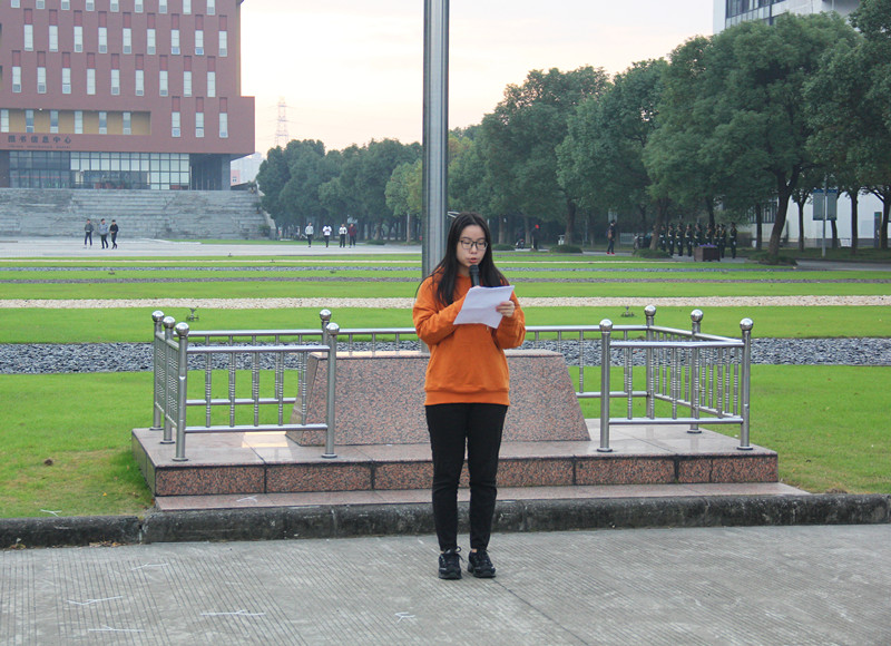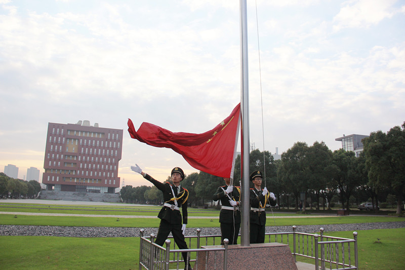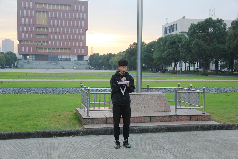 微寒的晨风中,英姿飒爽的国旗护卫队迈着整齐的步伐护送国旗进场。在朝阳下,庄严的国歌中,五星红旗冉冉升起。全场庄严肃穆,大家注视着五星红旗的升起,对祖国的热爱从心底油然而生。