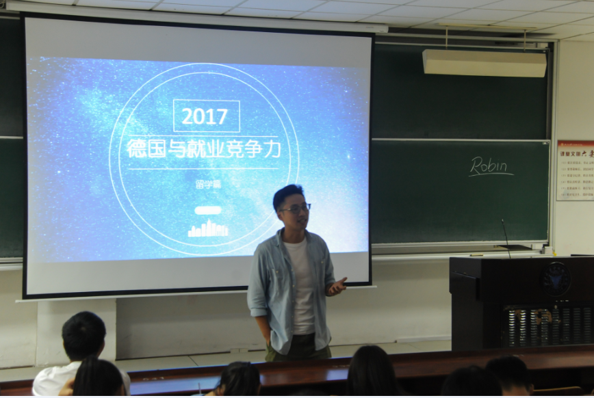 接着,王超先生向同学们分享了他在德国留学的经历,他侃侃而谈,刷新了以往同学们对于留学的印象,为我们带来了一个崭新的留学观念,同时也透彻的分析了现今普通毕业生与留学生的不同,积极鼓励同学们出国留学。并且,王超先生还与现场的同学们进行了积极的互动,现场教学德语发音,活跃起了现场气氛。