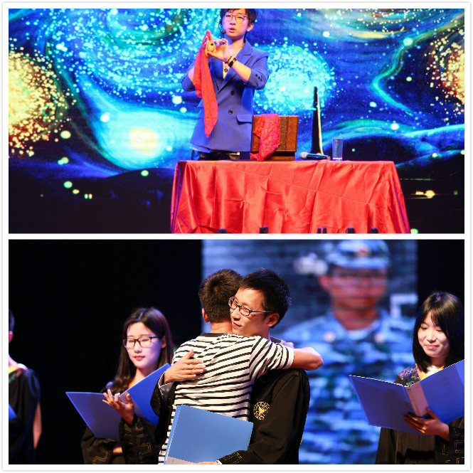 首先进行的是五四勋章颁奖环节,学院对本年度十佳寝室、优秀团员、优秀团干、优秀团支部、优秀班长、四好班级、十佳党员予以表彰。随后满载回忆照片的暖场视频在屏幕上循环播放,记录了毕业生们从青涩到成熟的一步步蜕变,从初入大学难以抑制的兴奋到挥泪离别的依依不舍;教师寄语表达了老师们对毕业生们的期待,字里行间透露着对毕业生真诚的祝愿。紧接着机能舞蹈队青春活力的开场舞瞬间点燃了全场的气氛;滑稽灵活的小人舞,引得大家捧腹大笑;气贯长虹的武术表演惊艳全场;旋律优美的《Good Life》与rap相交融,勾起我们青春的记忆;机能团学社小品《化肥场的二三事》轻松幽默,引得大家笑声不断;魔术《心灵召唤》更是赢得观众连连称赞,现场气氛达到高潮;淡淡的栀子花香,弥漫着这一季中特有的离绪,是“春风十里”的不如你;是“栖栖六月”的离别伤感,是“平凡之路”的“see you again”。四年,1460个日日夜夜,该有多少痴心迷醉的时刻,该有多少争分夺秒的朝夕,相逢又告别,归帆又离岸,我们在可珍相遇,又在可珍送别。