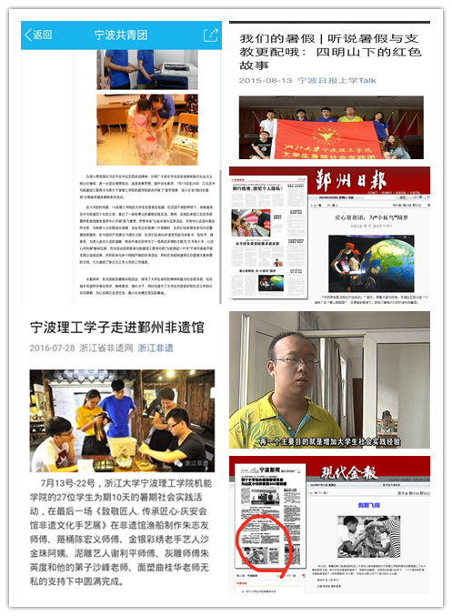 与此同时,学院暑期社会实践的影响力也不断扩大。学院暑期社会实践活动在服务第一课堂、强化地方合作、扩展思政教育方面也发挥了重要的作用。暑期社会实践活动先后获得鄞州电视台、浙江日报、东南商报、宁波日报、中新社、浙江非遗网、宁波文化网、宁波团市委等省内外有影响力的电视媒体、纸质媒体和网络媒体的专题报道。机能学子热情服务、求知钻研的实践态度受到了宁波团市委、地区团工委和各个社区、街道的关注和一致好评。
