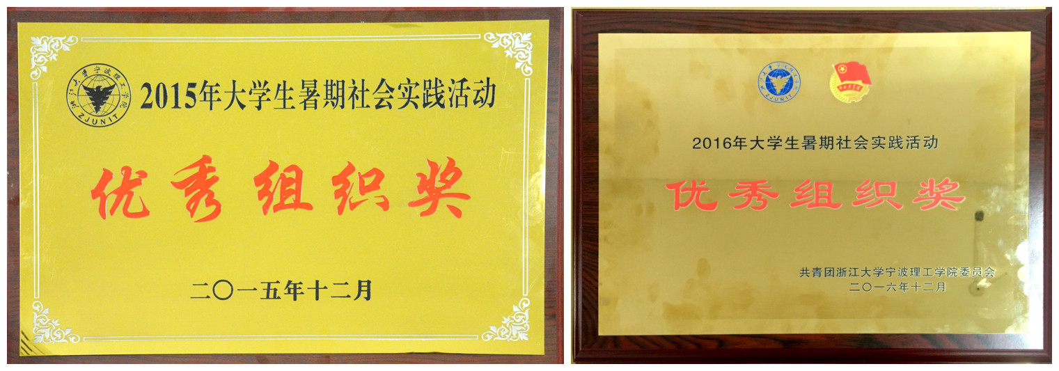 两年间,学院团委多支暑期实践团队和个人荣获省、市、校各级荣誉称号。其中,“义工,在路上——暑期爱心支教团”被推荐为2015年浙江省暑期社会实践先进团队、学院连续支教五年的实践基地鄞州区龙观乡被推荐为2016年浙江省优秀暑期社会实践基地、“与文化同行——宁波非物质文化遗产工匠精神调研团”获得2016年宁波市暑期社会实践优秀团队;汪力、李一波、徐星晔等同学先后获得宁波市暑期社会实践优秀参与个人,仇芳老师获得宁波市暑期社会实践优秀组织个人。