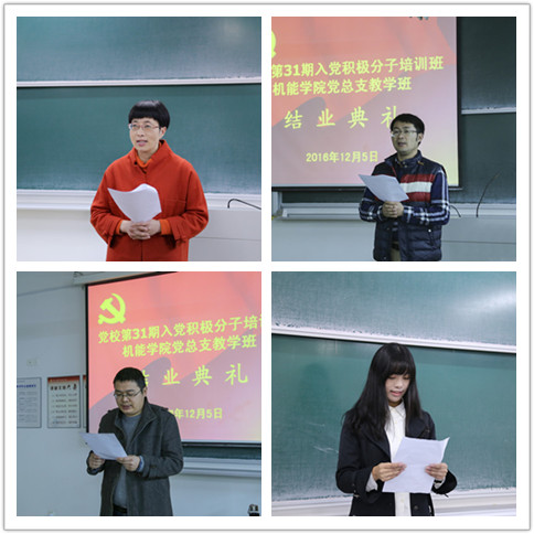 2016年12月5日,机能学院第三十一期入党积极分子培训班结业典礼于NB307如期举行。机能学院党总支书记吴春老师、思政主管胡鹿鸣老师、团委书记仇芳老师以及第31期全体党校学员出席了典礼。典礼由党校班导师王海波老师主持。