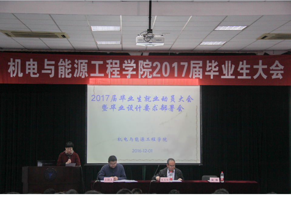 12月1日下午15:30,机能学院在NF103举行了2017届毕业生就业动员大会暨毕业设计部署会。出席本次大会的有机能学院院长陈光明教授、学院总支书记吴春老师、学校就业指导中心副主任廖海鹏老师、学校保卫处副处长叶卫树老师、学院各研究所负责人、毕业班班导师、学院党政办,教务办,学工办全体老师以及学院2017届全体毕业生。 会议由辅导员王海波老师主持。