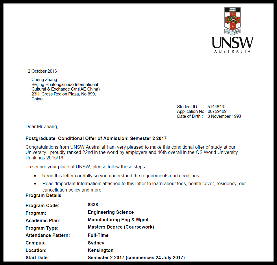 新南威尔士大学offer