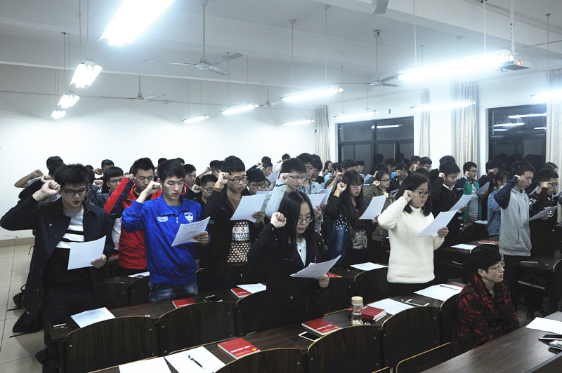 伴随着激昂的国歌,开学典礼正式拉开帷幕。首先由胡鹿鸣老师介绍本期培训班的授课计划,并对本期实践课程环节中针对“文明寝室建设工程”的要求作了详细部署。随后王海波老师宣读了培训班学员的课堂纪律和请假制度。紧接着,党校学员代表机制161班郑圣文同学发言并宣读《入党积极分子党校学员承诺书》,在郑圣文同学的带领下,全体党校学员紧握右拳,大声跟读,无一不透露着他们决心之坚定,理想之不凡。