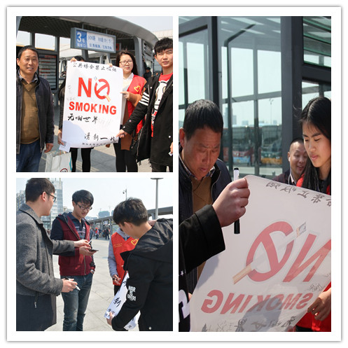 当大家向行人宣传禁烟活动时,那些沉浸在手机里的青年,停止游戏和电视剧,打开微信关注机能青协的禁烟活动的推送时感叹道:“吸烟有害健康”;火车站的人摩肩接踵,大家都加快自己的脚步奔走,却为了文明停下自己的步伐,放下行李,用最诚挚的心在禁烟海报上签下自己的名字以表自己对禁烟活动的支持,并在志愿者的指导下认真完成了一系列禁烟手势:我介意;不可以;请停止!
