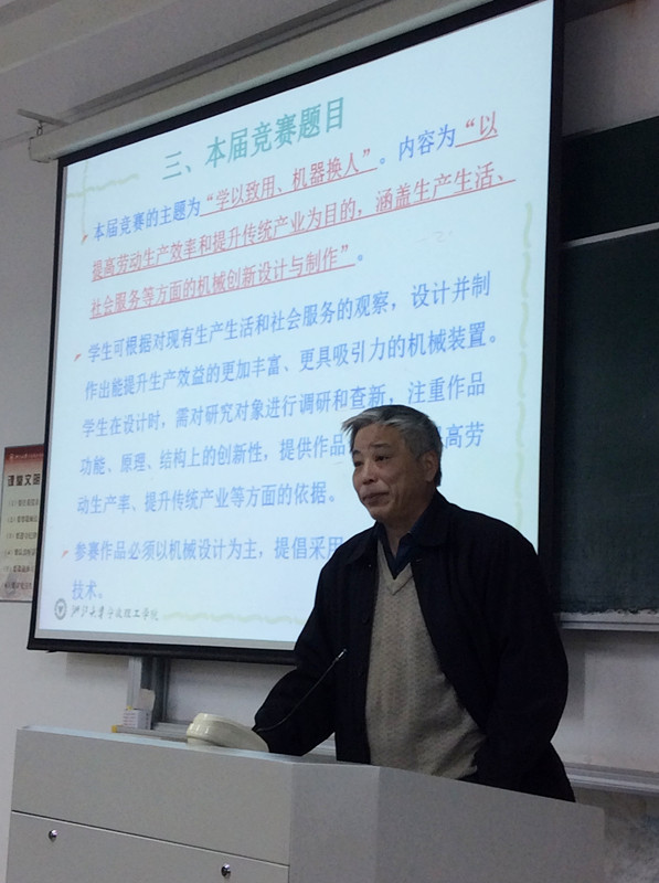 随后,多次指导学生在国家、浙江省及浙江大学机械创新大赛中获奖的沈萌红教授为大家详细讲解了本次竞赛的题目“学以致用、机器换人”,并且告诉大家审题的重要性,他强调说:“我们对题目要有自我的理解。从狭义上看重点在提高生产率,以提高传统产业为目的。而从广义上看,要涵盖社会生产,社会服务等方面。符合“学以致用,机器换人”。在整个流程中,先要进行市场调查,使用环境,适用人群,然后运动分析,并画出运动简图,最后进行参数分析。”并在广义上为我们举了例子:关注病人,社会服务类机械手。同时告诉我们关于本次主题可参考历届全国大赛的题目,学习往届一、二等奖的作品,从中汲取对自己有用的东西加以利用。他介绍说:“机器换人又分全部替换和部分替换,而我们要替换的是人们最不想做的部分。”