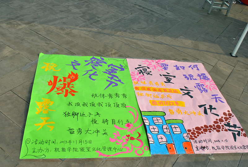 为了丰富同学们的课余文化生活,增进寝室成员之间的友情,增强团队合作能力和寝室的凝聚力。2013年11月15日,机能学院第七届寝室文化系列活动之玩爆露天在露天广场顺利举行。