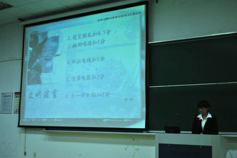 活动一开始,学院寝室文化管理中心同学先介绍了寝管各部门的构成及工作范围,点评了这个学期以来的寝室卫生,并评选出了“十佳寝室”。随后,寝管展示了本学期“3.15维权服务周”的成果展示,“饮食卫生”、“寝室内被乱投广告”等学生反映的问题,经过多次的协调,得到了很好的处理与改善。