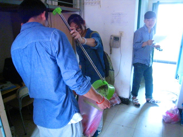 本次入党积极分子培训班实践课程内容为服务毕业班整改寝室卫生,主要在23幢的机能大四学生寝室以及24幢的走廊进行卫生清理。在23幢一楼,许多寝室的大四学长们都很愕然于积极分子们的到来,但很快,寝室的学长们都积极配合起了卫生清理工作。不一会儿,寝室里一片热火朝天。