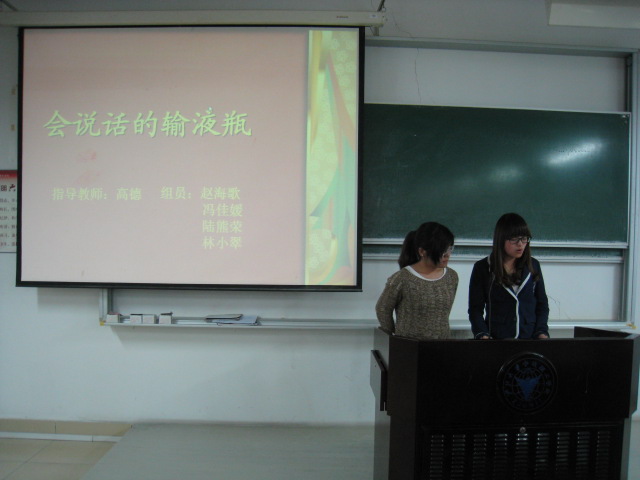 此次设计大赛共有13组作品参赛。同学们用精美的PPT,图文结合的方式来展现自己作品的新颖和独特性。而老师争对各个参赛作品给出评价和中肯的建议。其中“会说话的输液瓶”、“花式茶杯套装”等作品获得老师好评。通过创新性,销售外观、功能结构合理性,绿色节能环保性、实际应用性这五个方面综合考虑,第一名颁给了“花式茶杯套装”,第二名则由“会说话的输液瓶”夺得。另外还有4个作品获提名。