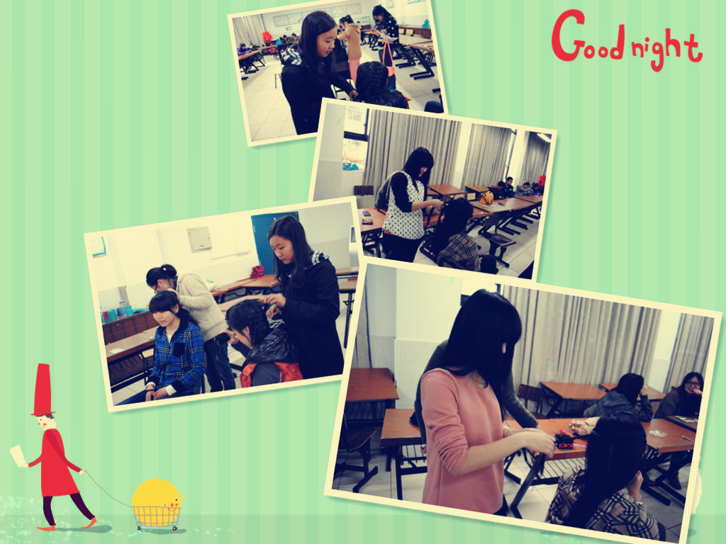 第一个环节是最美女生编发大赛。姑娘们披散着头发坐成一排等待“发型师”一展身手。前来参加活动的女生大多以寝室为单位,只见她们一边欢快的与“发模”交流,手上功夫也丝毫不松懈,编麻花,别发卡,一切都有条不紊。半个小时后,一位位“发模”为我们展示了各具风格的发型,或精致,或淑女,或奔放,看得评委观众眼花缭乱。