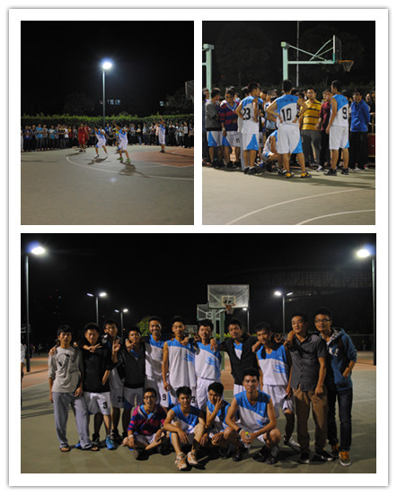 10月15日晚机能学院和经贸学院在灯光球场进行了新生篮球的冠亚军争夺赛。机能运动员身着蓝色球衣,经贸运动员身着红色运动服。比赛还未开始,篮球场周围已围满了拉拉队员。掌声,鼓声,呼喊声已不绝于耳。