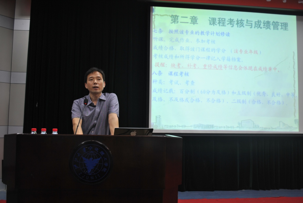 随后,分院学工办主任胡鹿鸣老师为同学们详细解读了《学生手册》,着重就学生考勤管理、违纪处分、综合测评、评奖评优、勤工助学、助学贷款、医疗保险、文明公约和生活园区文明建设等方面内容进行了介绍。胡老师以一个个案例和一系列数据为例,希望新同学们能尽快熟悉和了解学院各项规章制度,秉着对自己负责、对家长负责、对学校负责和对国家社会负责的态度,严格遵守各类规章制度,文明自己的言行,做到有所为有所不为,度过积极向上的大学四年。