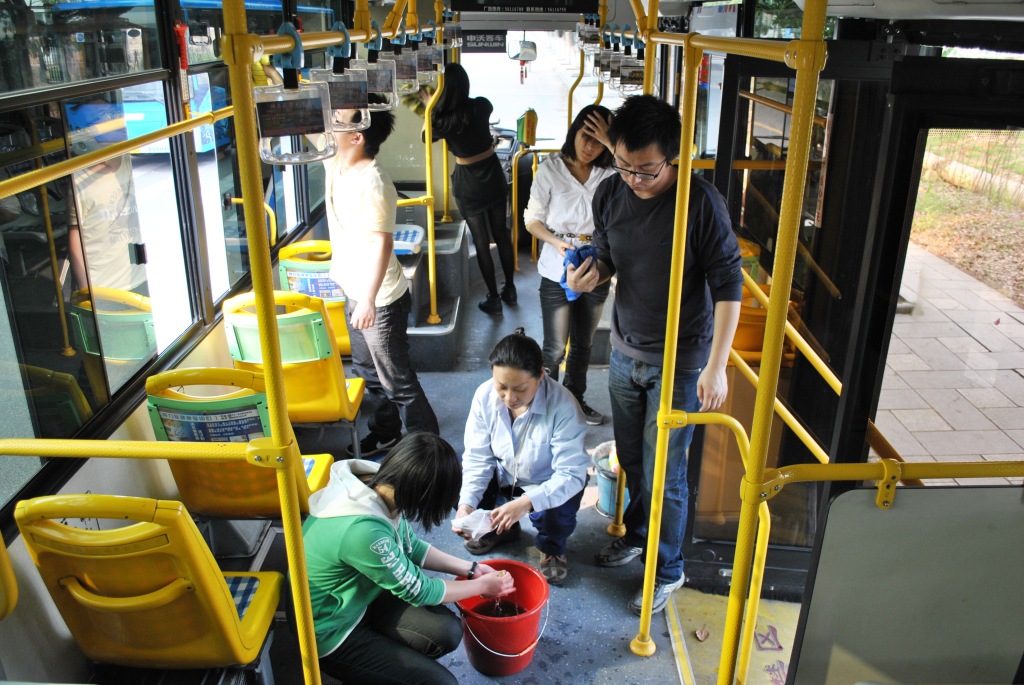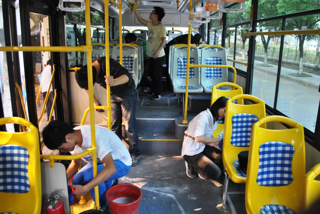 机电骨干们在附近的公交车底站把每辆公交进行了全面的清洗与打扫。天气气温虽然很高,但同学们并没有因为天气的炎热而退缩,而是拿着抹布在站台阿姨的指导下对车厢的各个角落进行了全面的大扫除。经过几个小时的努力工作,同学们将停靠在站台的公交车擦得干干净净。在整个擦车的过程中,尽管活动很累,但骨干们毫无怨言。路过的群众纷纷投来赞叹的目光,站台阿姨更是赞赏的说:“我一直以为现在的大学生都是娇生惯养的,不过今天看到你们的积极劳动,让我有了很大的改观。”