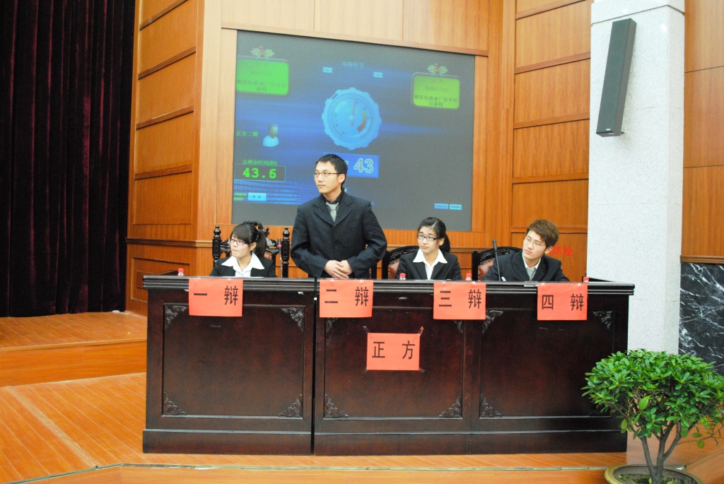 3月23日晚,学院第九届学术科技节之“辩话无穷”——2011年“求是杯”辩论赛,第一轮第三场在模拟法庭举行。此次辩论赛由机电分院辩论队对抗外语分院辩论队。场上双方辩手围绕“明星拍商业广告可不可以虚构”展开了激烈的争辩,我方作为正方观点是可以虚构,辩论队成员是一辩包装092班方芸芸、二辩能源081班严驰、三辩能源101班赵中辉、四辩包装101班单佳莹。辩论队指导老师刘炳辉观摩了整场辩论。