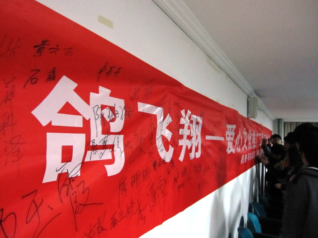 最后,全体青年志愿者协会的成员在横幅上庄重的签下了自己的名字。这简简单单的一个动作代表了青年志愿者的决心和承诺。
