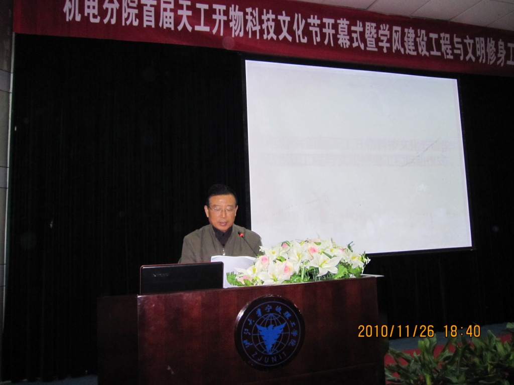 首先,王龙山院长上台致开幕词。王院长在讲话中谈到机电分院长期以来一直高度重视人才培养工作,广大老师辛勤地付出,归根结底还是为了“教书育人”四个字。高等教育在当代承担着日益复杂的社会责任和角色,如何在新的条件和形势下将这些职能和力量进行整合,分院首届天工开物科技文化节的隆重推出,就正是在这方面的一个重要尝试。最后,王院长还以一位六十多岁的长者的体会对在场同学提出以下四点期望:一是树立远大理想,使之成为生产动力;二是勇于克服困难,争取获得更大得成功;三是加强同学间协作交流能力,促进自身全面发展;四是时刻抱有一颗仁爱之心,关心他人关爱自己。院长的这番话,无不给在场每位师生指明了今后工作和学习的方向与动力,他热情洋溢的演讲也不时赢得了师生们阵阵热烈的掌声。