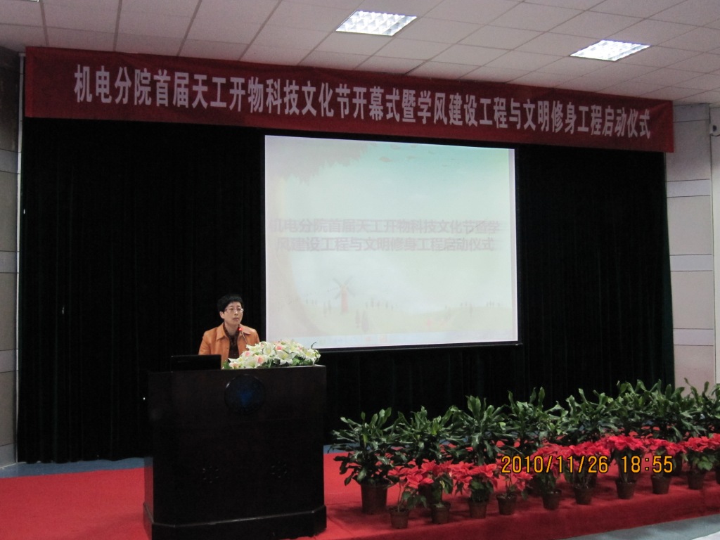 接着,由吴春副书记上台宣布首届天工开物科技文化节暨学风建设工程与文明修身工程启动仪式开幕并作简短讲话。她以感恩机能,科技机能,务实机能为主题分别对前段时间的学风建设工作做了总结评论并对之后的建设要求进行了展望。同时强调了学生在专业学习与理论实践结合方面的重要性所在,还列举一系列活动对其进行了丰富拓展。并将"优良学风人人共建,学风优良人人共享”16个大字了送给每位机能学子,传递了她的祝福与心愿。