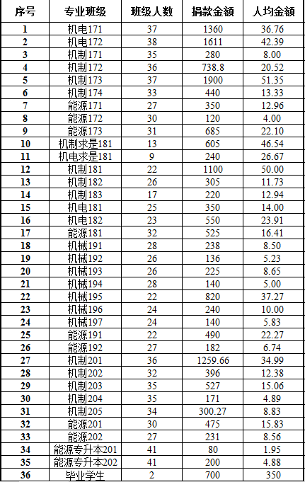 经广泛宣传发动和组织,机能学院第16次“学生爱心基金”集中募集活动已圆满结束。在本次募集过程中,各班级精心组织,广大同学踊跃捐款,用自己的实际行动唱响了“让节俭成为一种习惯,让关爱成为一种品质”的口号,营造出全校学生积极参与,奉献爱心的良好氛围,截至2021年1月13日,学院学生捐款金额共计18330.73元。现将各班级“学生爱心基金”集中募集金额和各类先进名单予以公布。