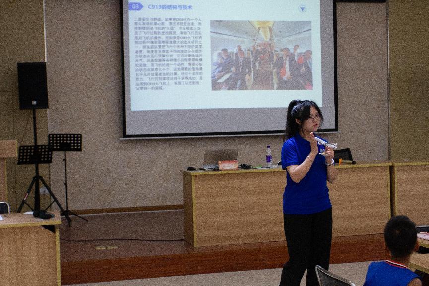 在中国国产大飞机C919的宣讲中,当宣讲员问小朋友们C919中C是什么意思时,所有小朋友异口同声地说CHINA。尽管最小的小朋友仅仅5岁,但诚挚的爱国之心,源于中国人骨子里的基因。宣讲后就是机械玩具拼装的环节。每一位小朋友领到一套拼装玩具后,由一位社会实践团成员进行指导答疑,帮助小朋友们完成拼装以及其运动原理讲解。小朋友们都积极参与,现场氛围热闹。