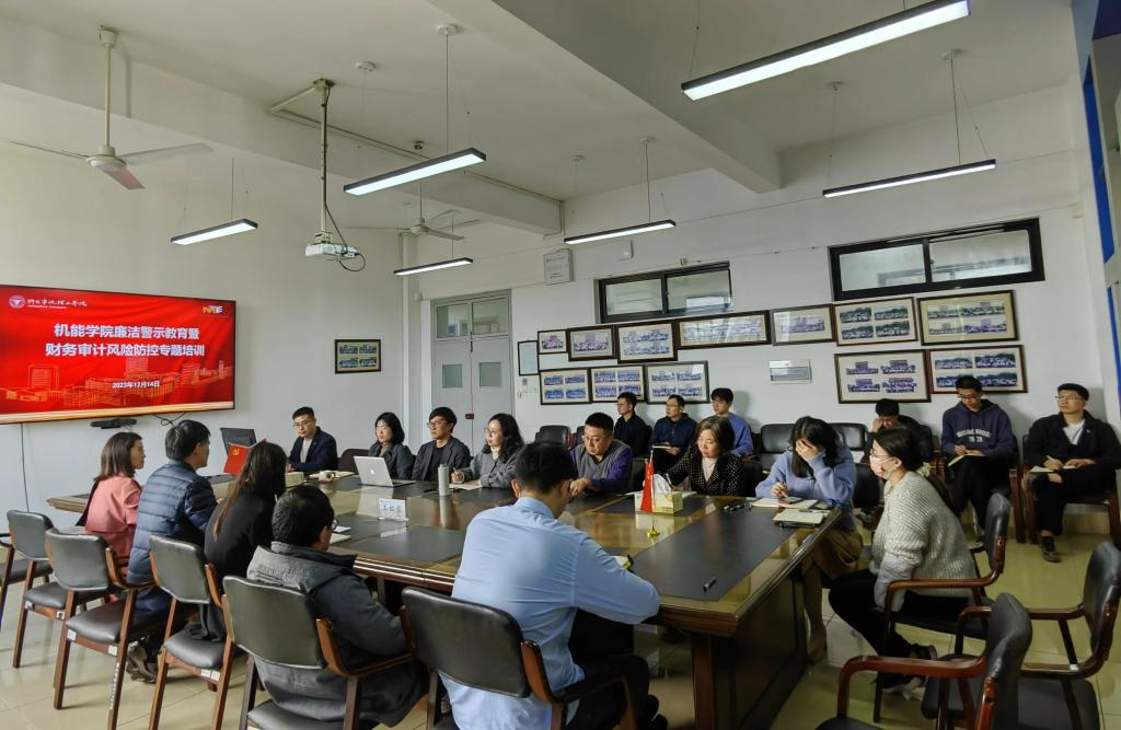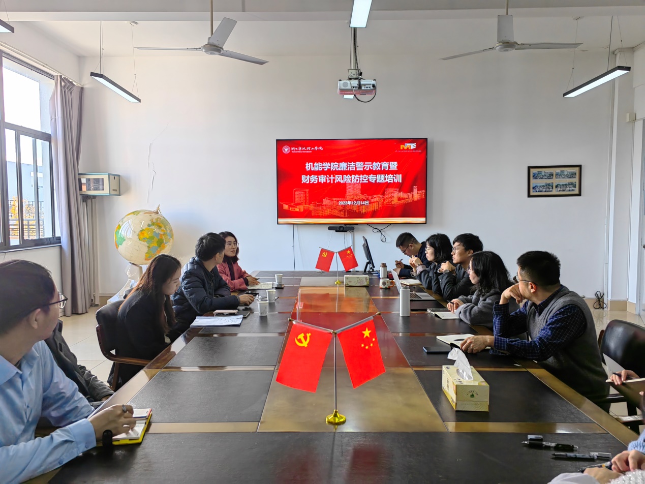 为深入学习贯彻党的二十大精神,持续推进“清廉理工”“清廉机能”建设,进一步增强教师的廉洁自律意识,2023年12月14日,机电与能源工程学院纪委邀请学校审计处处长陈敏东、业务人员王祖蓉,来院开展财务审计风险防控专题培训。培训由学院党委副书记、纪委书记林建英主持,学院副院长高能、科研骨干和行政教师等参加会议。