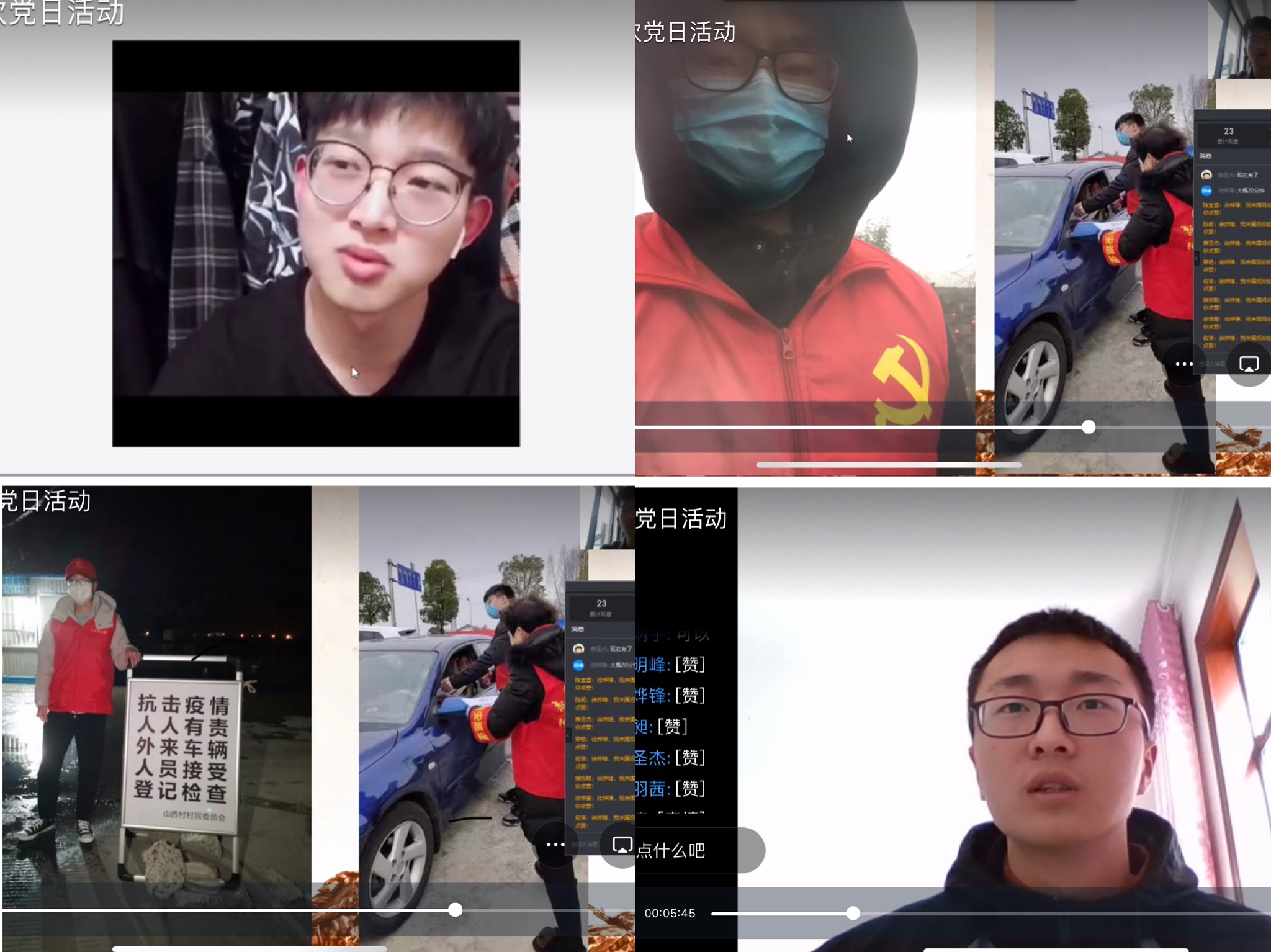本次党日活动在《这就是中国》这部纪录片中拉开序幕。主讲人张维为教授说道:中华民族有“一方有难,八方支援”的文化传承,中国共产党有以人民的生命安全高于一切的政治理念,有强大的组织能力,动员能力和协调能力,中国人民有强烈的家国情怀,众志成城,共战疫情,还有无数辛勤的医务人员和基层工作者和志愿者以及大型企业,全体中国人民齐力打好疫情的阻击战和总体战,为世界各国做出了好榜样!”这些话引起了全体支部党员的共鸣:正是全体伟大的中国人民共战疫情以及无私为他国奉献防疫物资和经验的实际行动,为世界防疫事业设立了新标杆。在本次新冠肺炎疫情防疫工作中,支部有多名同学投入到当地的防疫志愿者工作中,本次党日活动也邀请了两位同学分享了自己志愿服务的经历和体验。