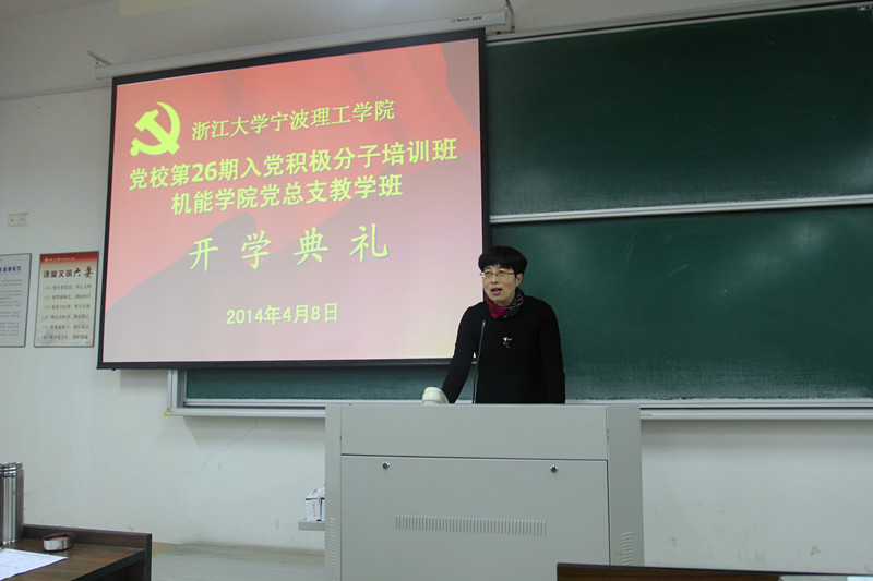 2014年4月8日下午,浙江大学宁波理工学院党校第26期入党积极分子培训班机能学院党总支教学班开学典礼在NB305顺利举行。学院党总支书记吴春老师、思政主管胡鹿鸣老师、副主管吴琼老师、学工办刘炳辉老师、党校班导师仇芳老师、全体参训学员出席了典礼。典礼由邬旭东老师主持。