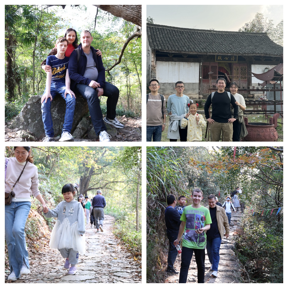 老师们悠然地漫步在充满历史韵味的古道上,身旁是五彩斑斓的秋景。道路两旁的树木像是被大自然这位神奇的画师精心装扮过一般,枫叶红得似火,银杏黄得如金,在微风的吹拂下,偶尔有几片叶子打着旋儿飘落,仿佛在为这秋日的乐章增添几分灵动的音符。老师们一边走着,一边沉醉于这迷人的秋色之中,感受着秋天独有的宁静与美好,或许还会时不时地停下脚步,轻声交谈几句,分享着此刻内心的惬意。