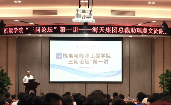10月14日下午18:30,机能学院在启新大讲堂举行“三问论坛”第一讲—海天集团总裁助理虞文贤讲座。机能学院党委书记童微星老师、党委副书记王晶老师、思政副主管仇芳老师、辅导员王海波老师、阮佳蒂老师和近三百名大一、大四学生参加论坛。