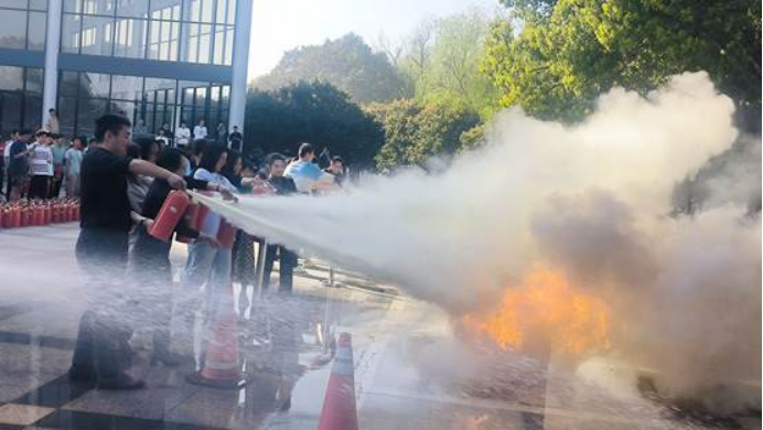 随后,师生前往可珍讲堂门口,现场观摩了消防器材的使用方法,并进行了火灾逃生器材实操教学。