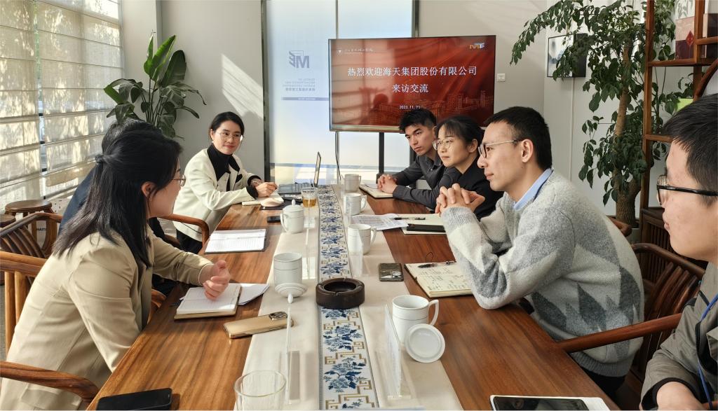11月23日上午, 海天集团股份有限公司人力资源本部招聘经理张程斐、海天智胜金属成型设备有限公司办公室主任李玲艳等一行4人到浙大宁波理工学院机电与能源工程学院就双方后续的产学研深度合作进行对接洽谈。学院党委书记江美芬,副院长张学昌,副书记林建英,钱孝华老师和辅导员刘杜娟参加了会议。